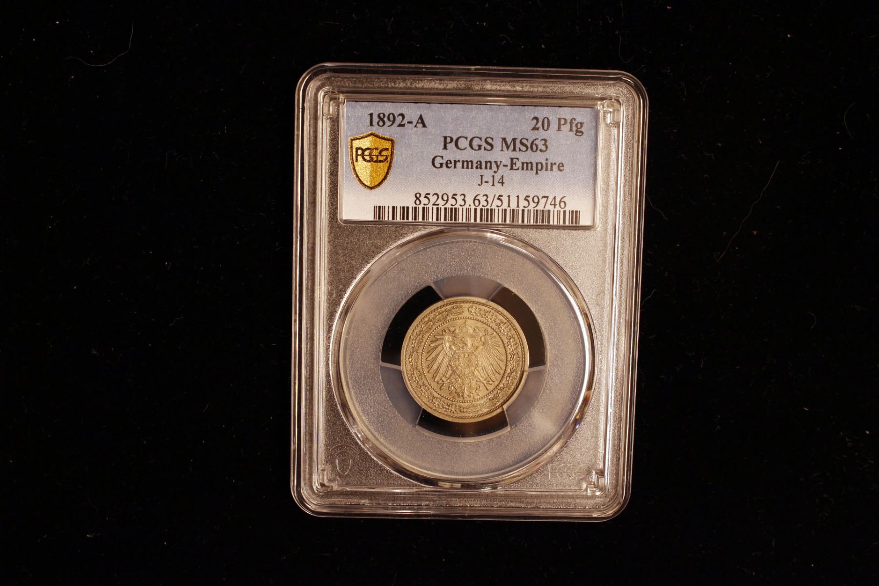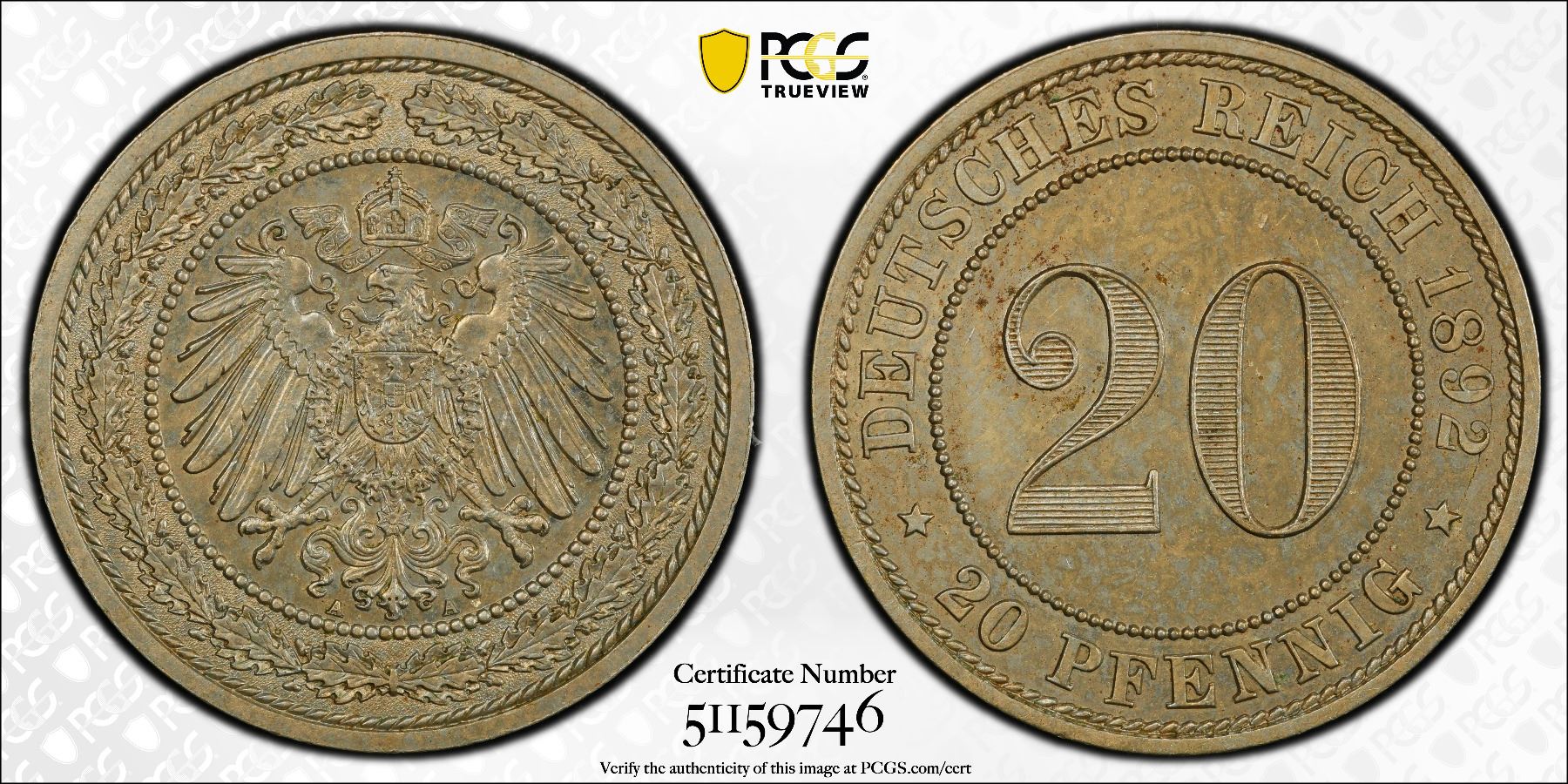 GERMANY: Kaiserreich, 20 pfennig, 1892-A, KM-13, Y-10, J-14, a lovely example, PCGS graded MS63.