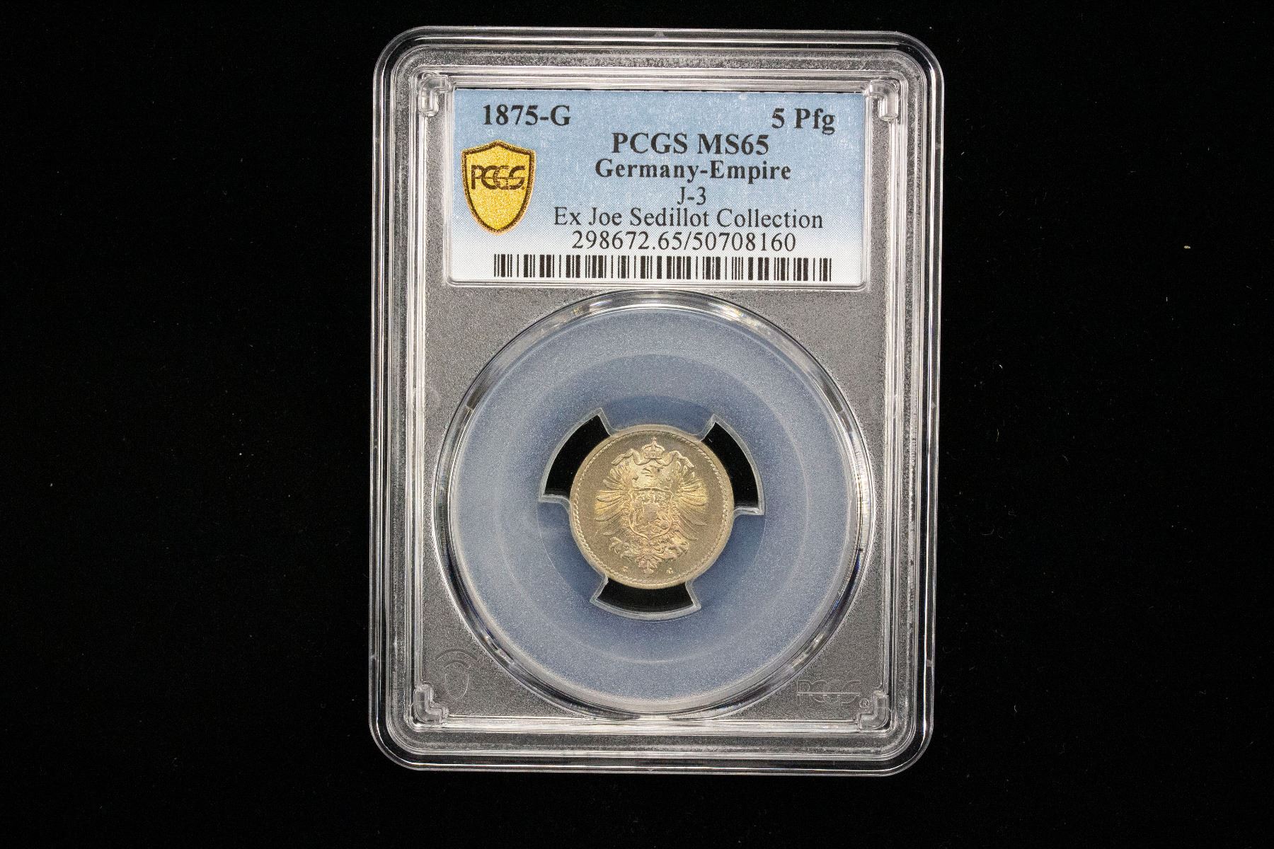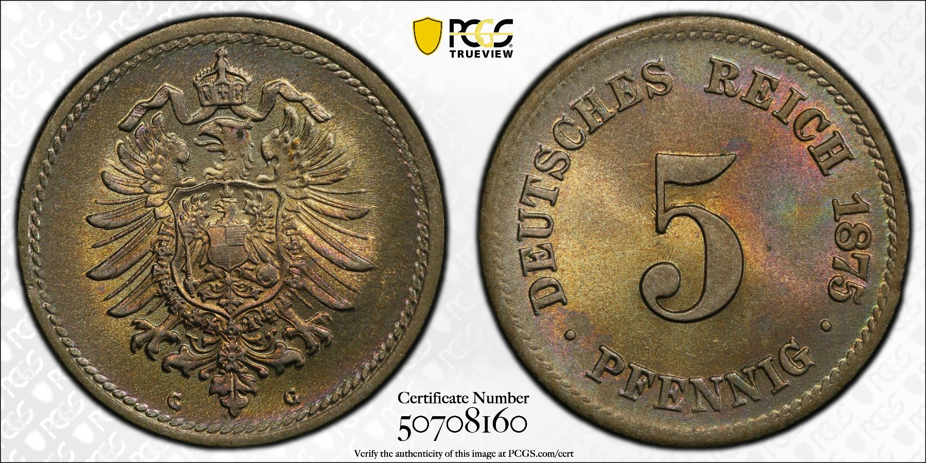 GERMANY: Kaiserreich, 5 pfennig, 1875-G, KM-3, J-3, a superb mint state example! PCGS graded MS65, ex Joe Sedillot Collection.