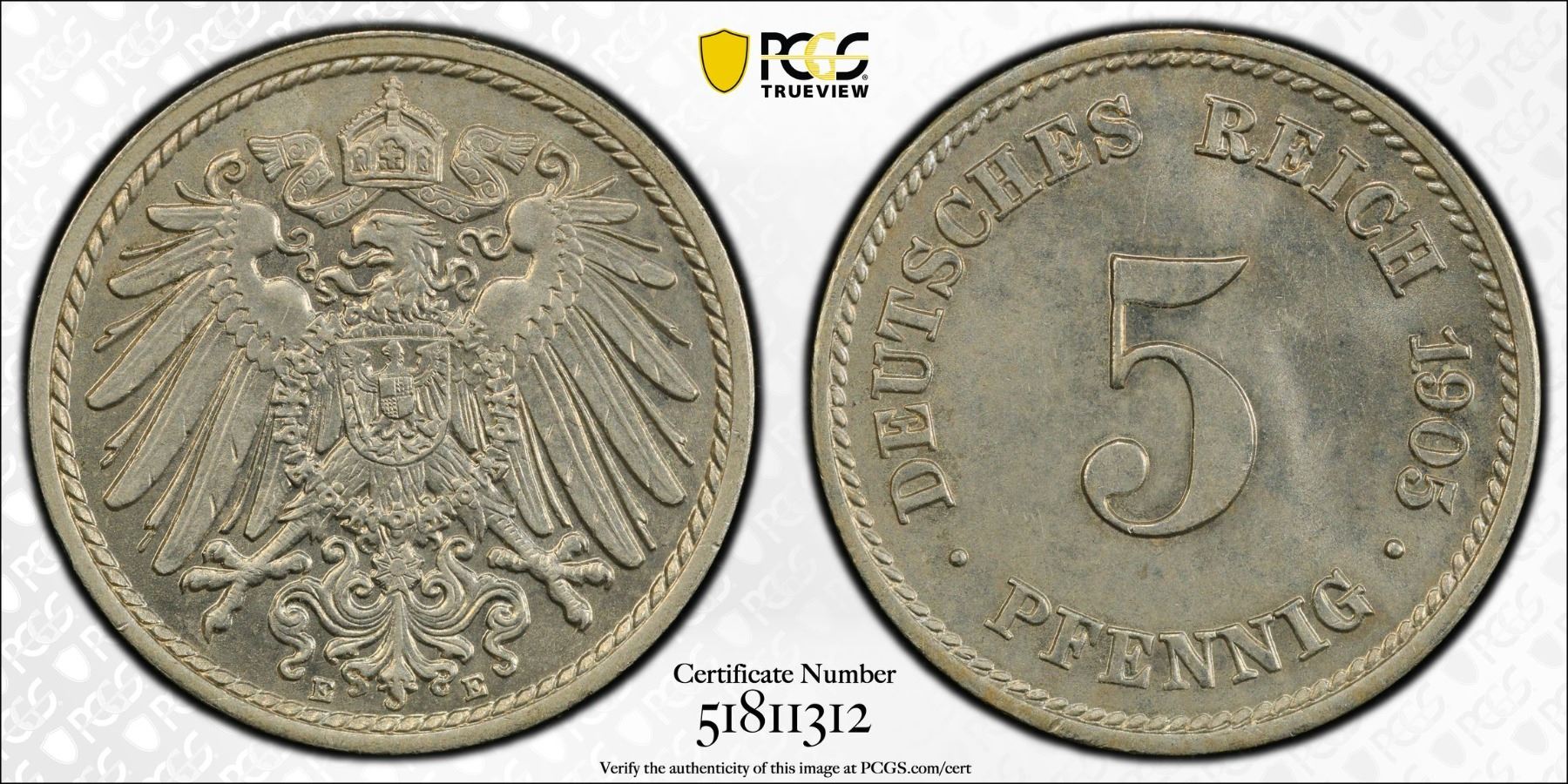 GERMANY: Kaiserreich, 5 pfennig, 1905-E, PCGS MS64