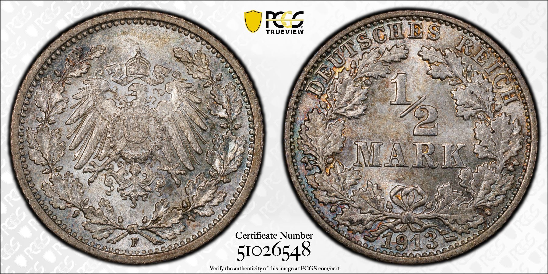 GERMANY: Kaiserreich, AR 1/2 mark, 1913-F, KM-17, J-16, a superb mint state example! PCGS graded MS65.