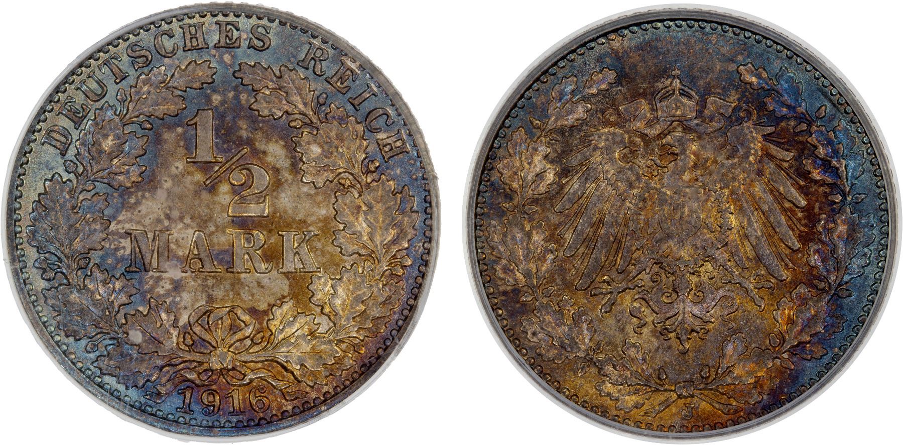 GERMANY: Kaiserreich, AR 1/2 mark, 1916-J, KM-17, beautiful blue and gold toning, a lovely example! PCGS graded MS66.