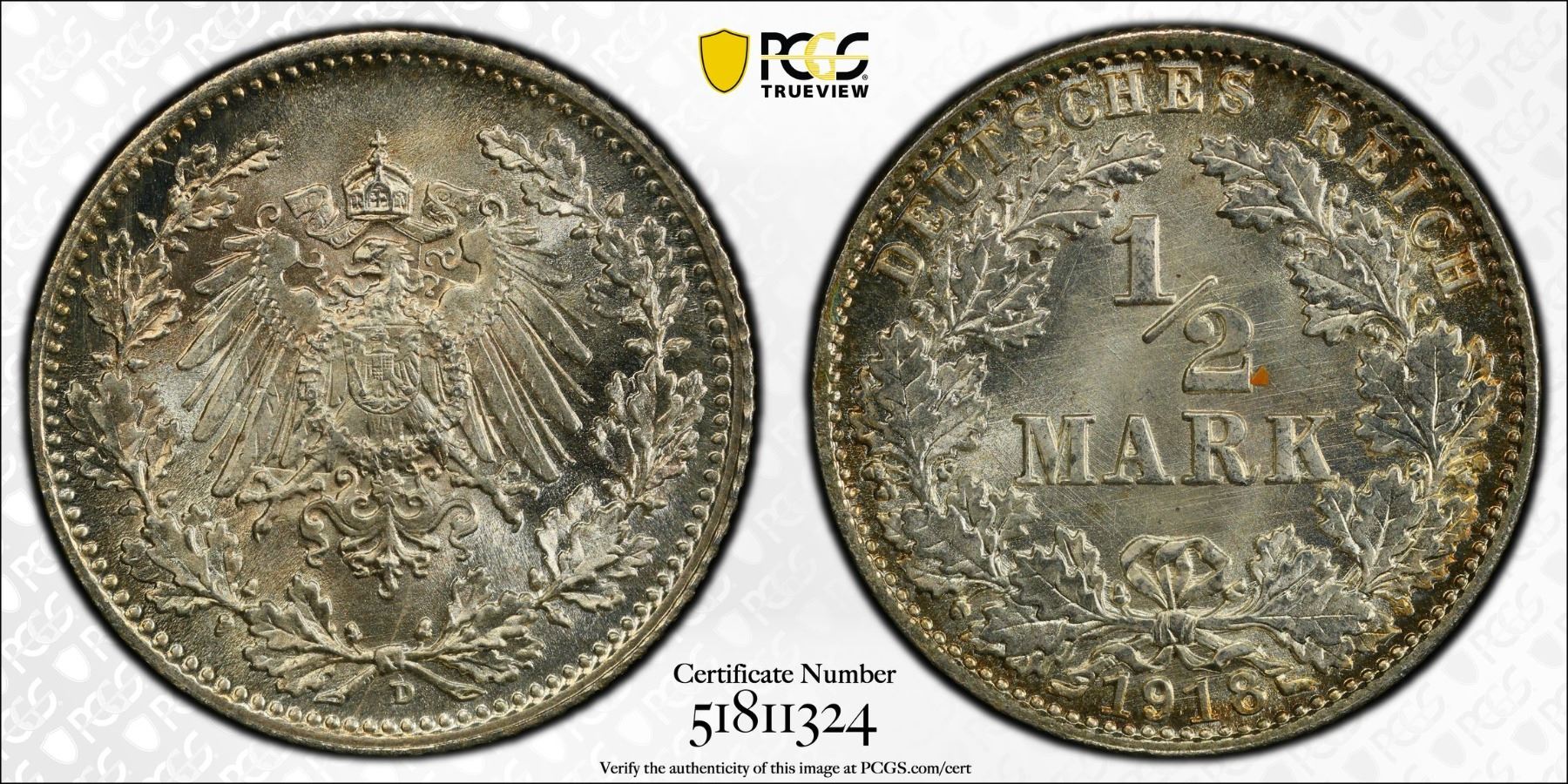 GERMANY: Kaiserreich, AR 1/2 mark, 1918-D, PCGS MS67 +