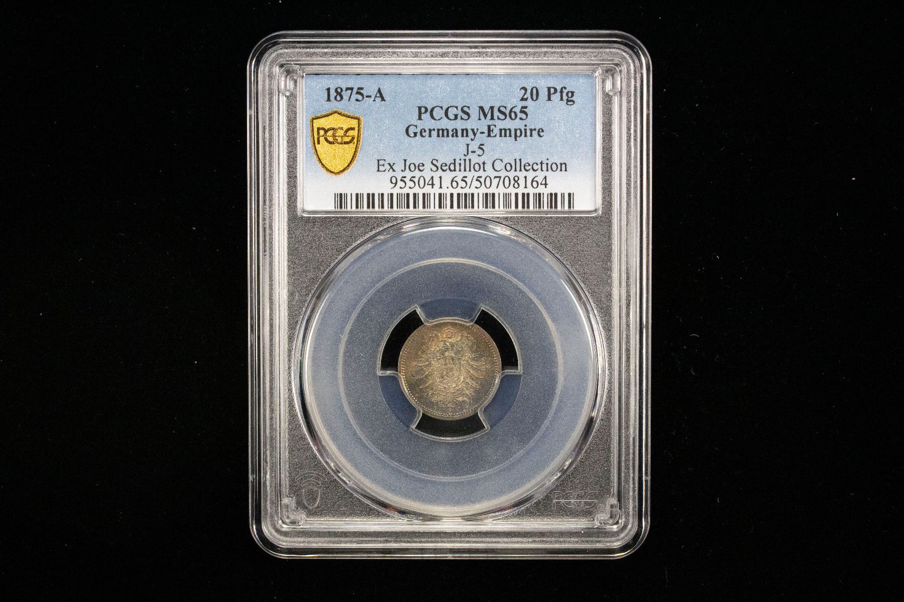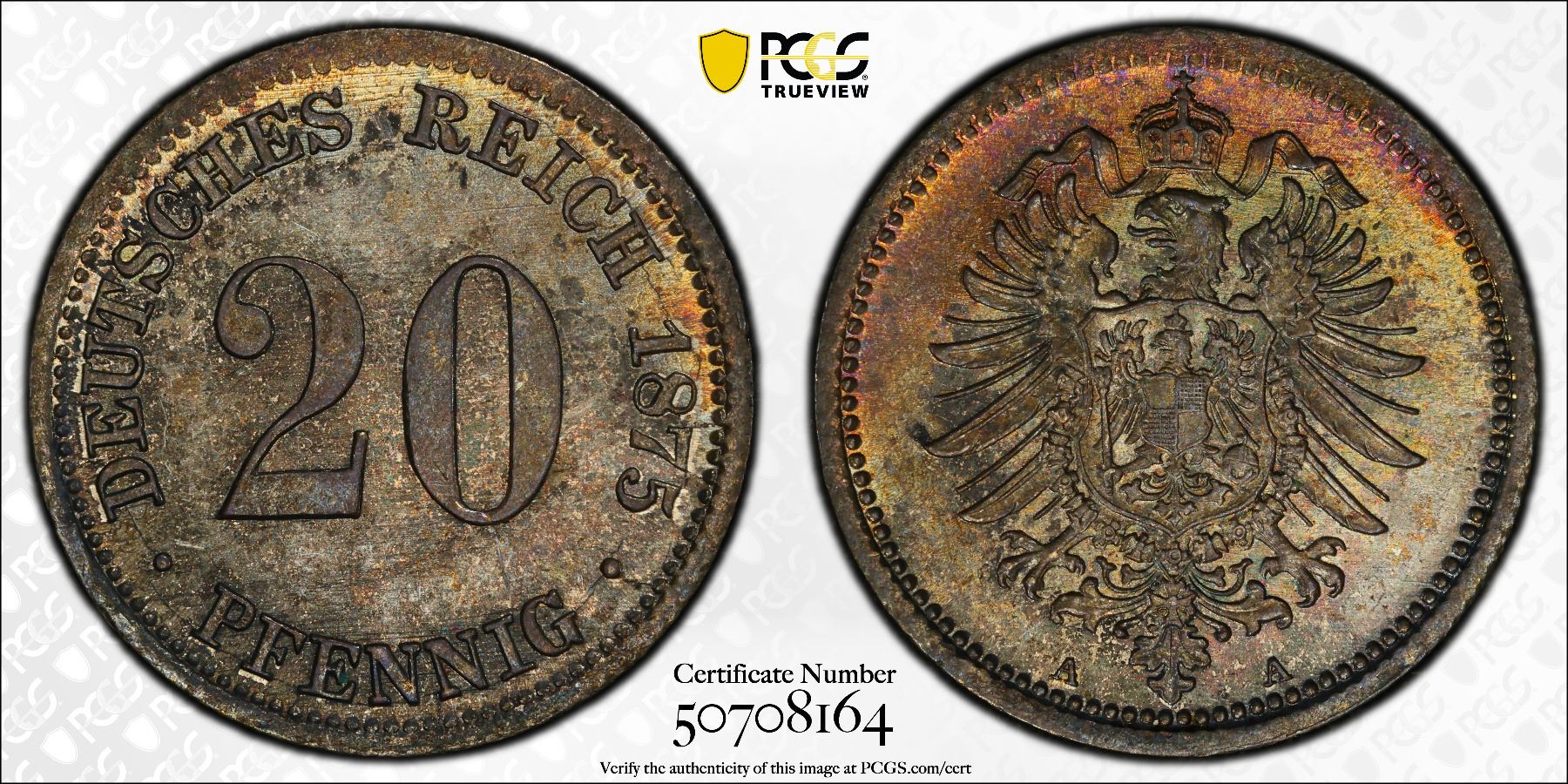 GERMANY: Kaiserreich, AR 20 pfennig, 1875-A, KM-5, J-5, a superb toned lustrous example! PCGS graded MS65, ex Joe Sedillot Collection.