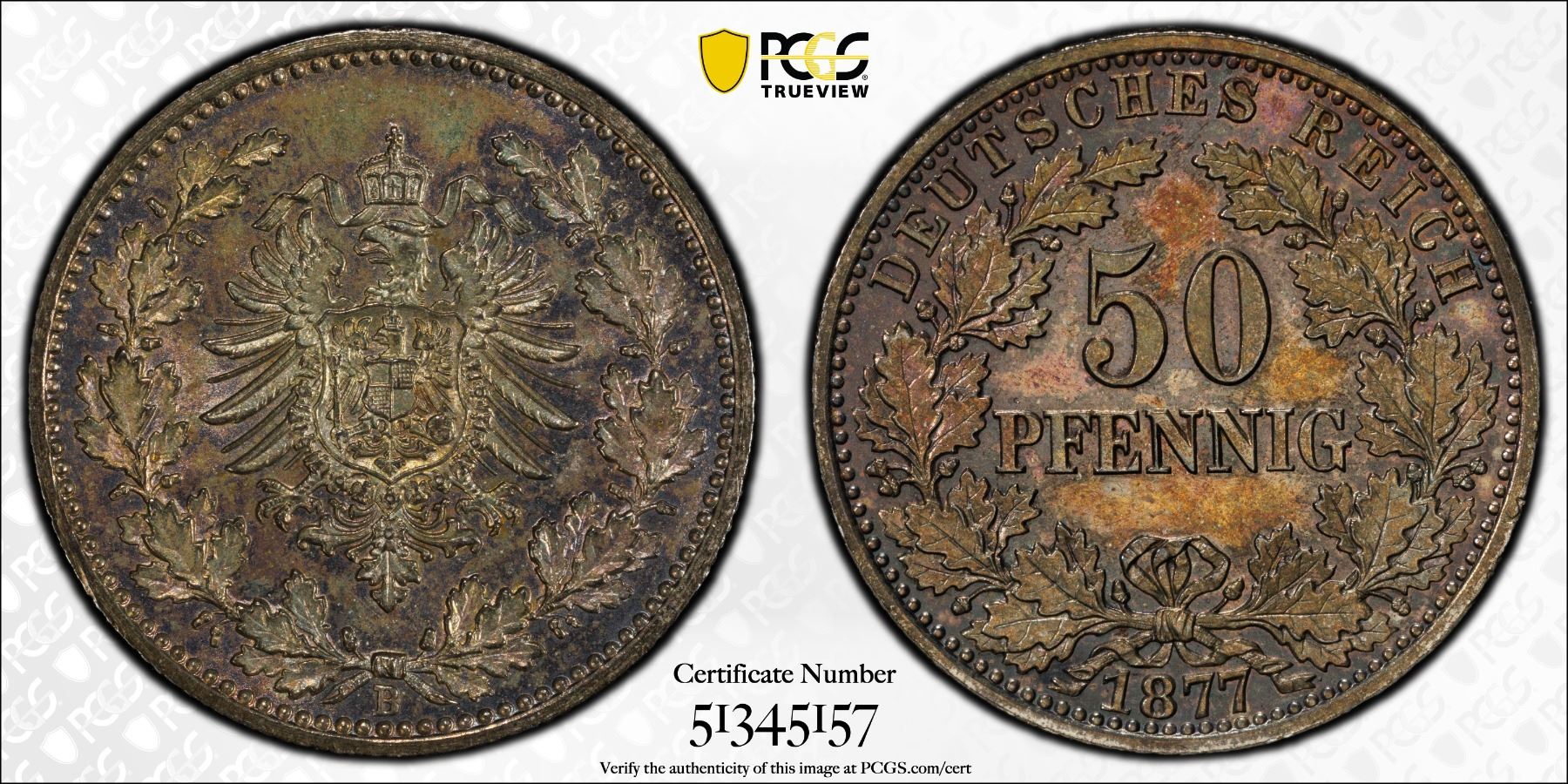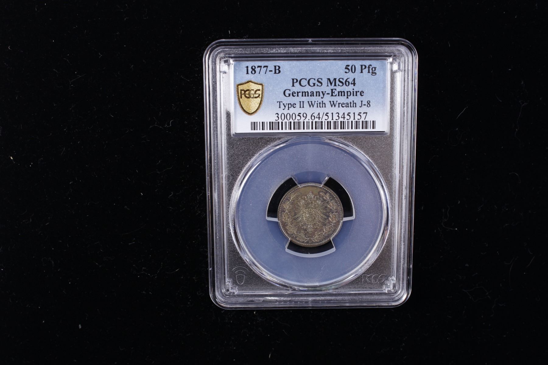 GERMANY: Kaiserreich, AR 50 pfennig, 1877-B, KM-8, J-8, type II with wreath, a wonderful lustrous example! PCGS graded MS64.