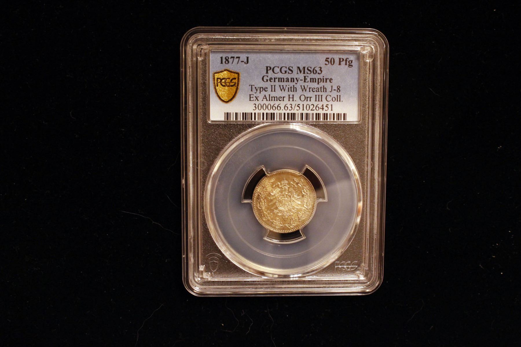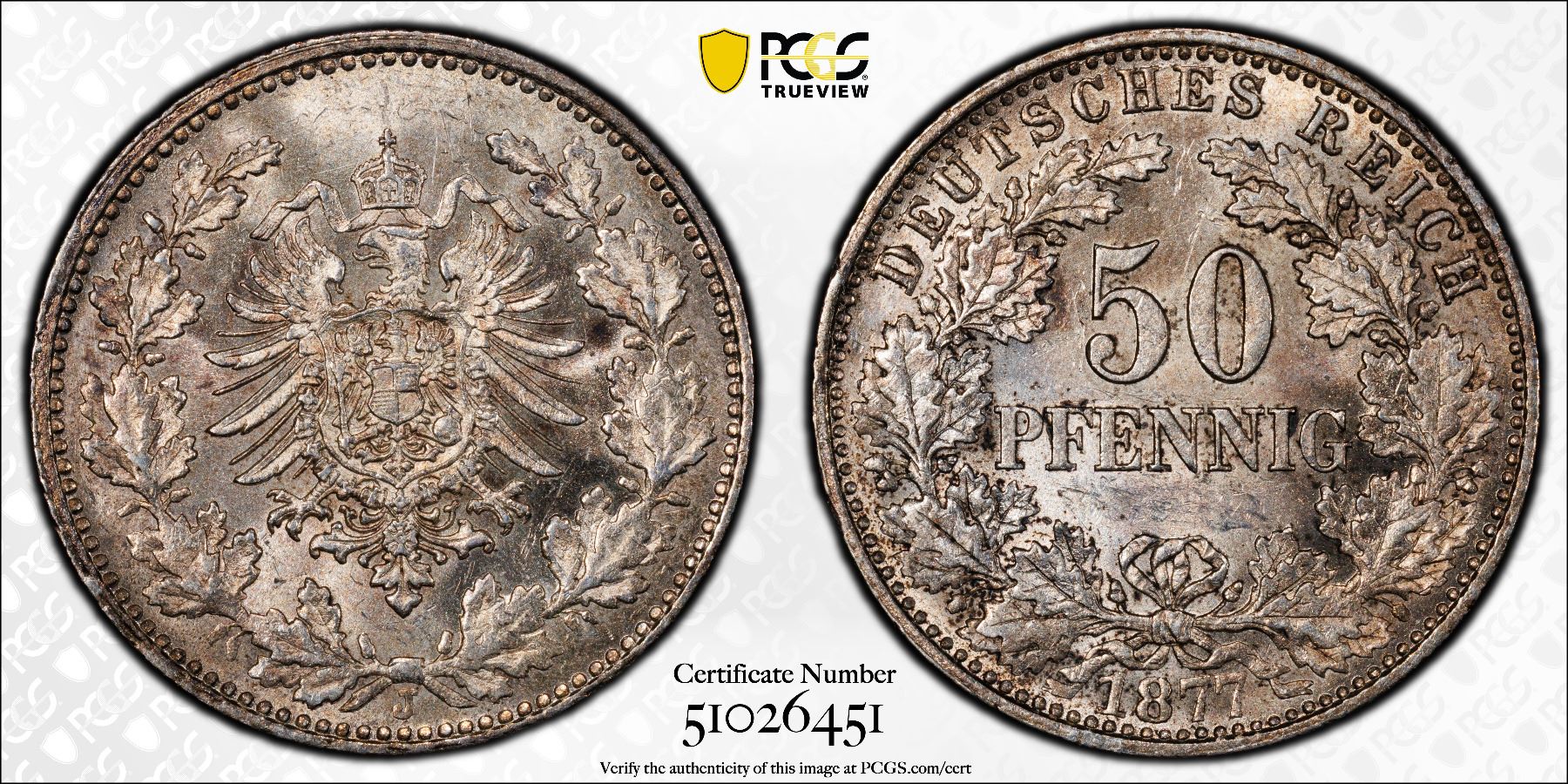 GERMANY: Kaiserreich, AR 50 pfennig, 1877-J, KM-8, J-8, type II with wreath, a lovely lustrous example! PCGS graded MS63, ex Almer H. Orr III Collection.