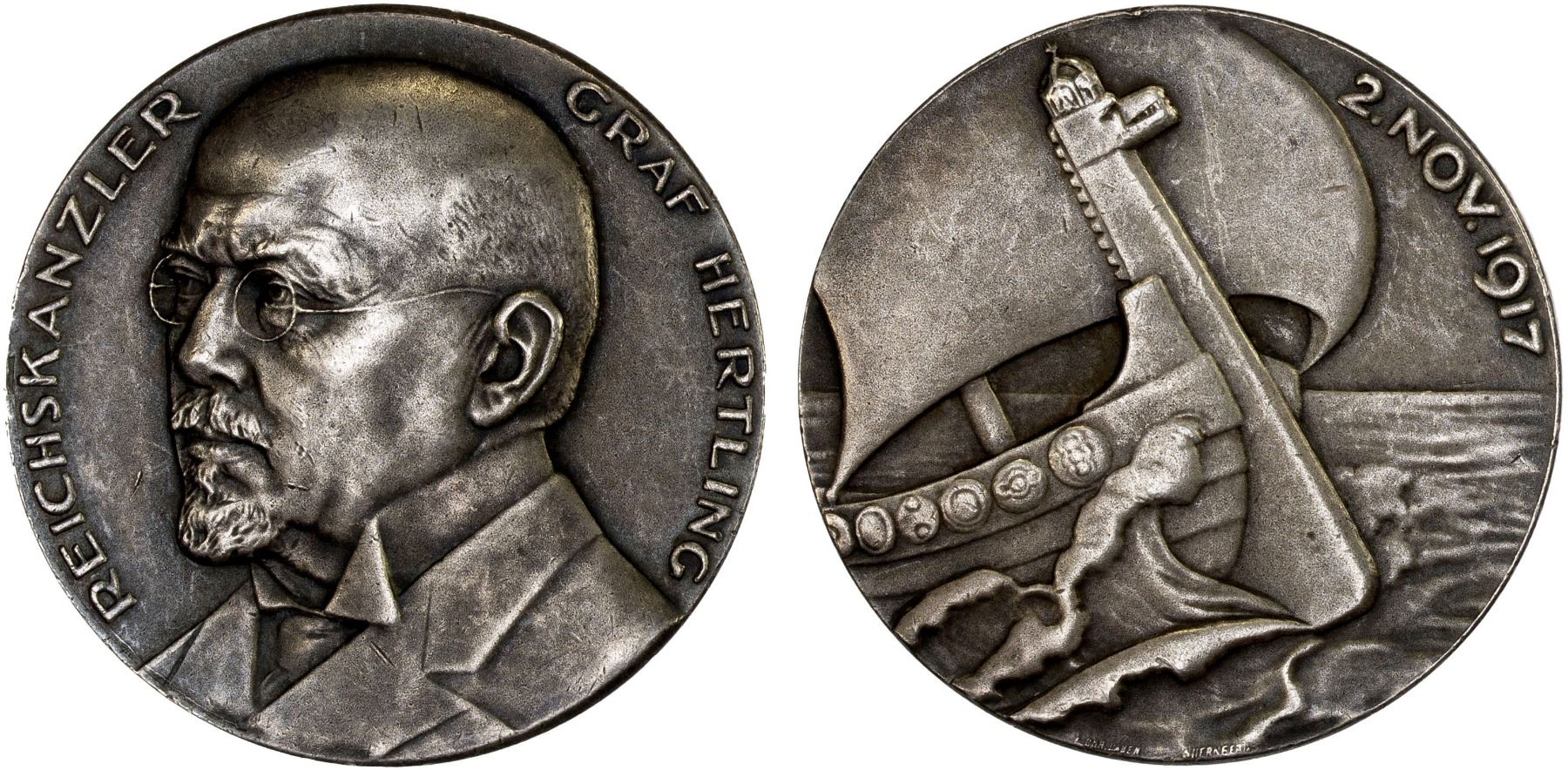 GERMANY: Kaiserreich, AR medal (14.56g), 1917, Zetzmann-2178, 33mm silver medal for Georg Friedrich Karl Freiherr von Hertling, Imperial Chancellor, by L. Chr. Lauer, Nuremberg, bust three-quarter left with REICHSKANZLER - GRAF HERTLING around // front of Viking ship crashing through a wave with "2. NOV. 1917" around, matte finish, "990" on edge, XF.