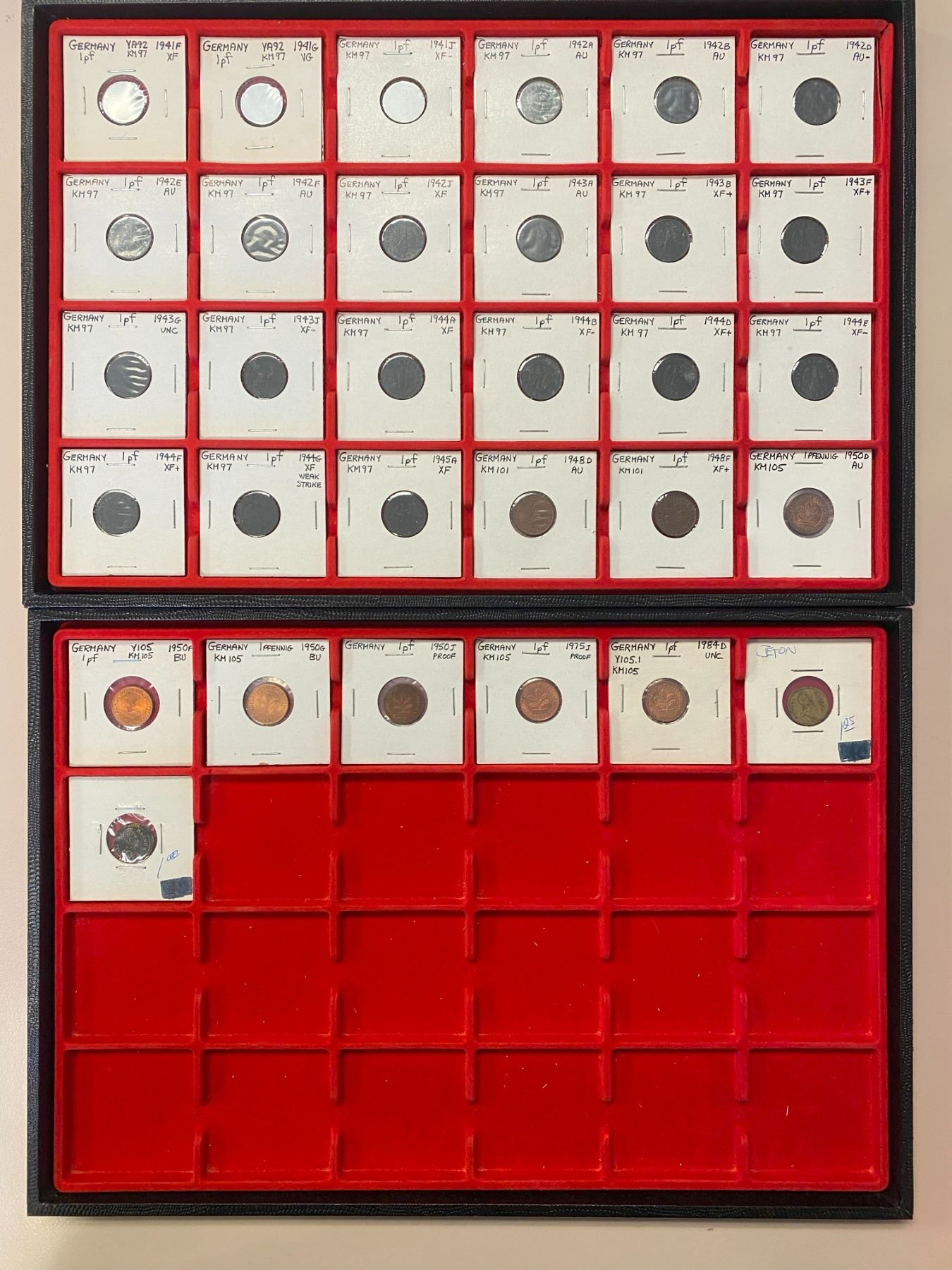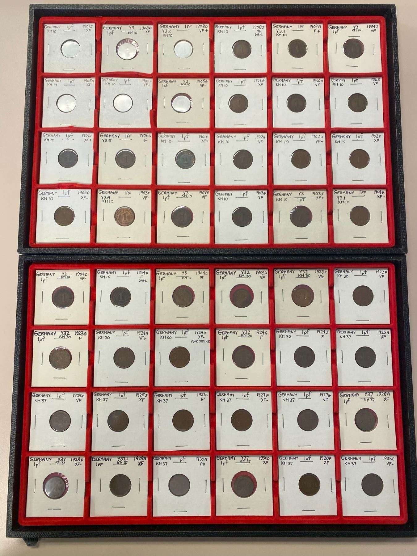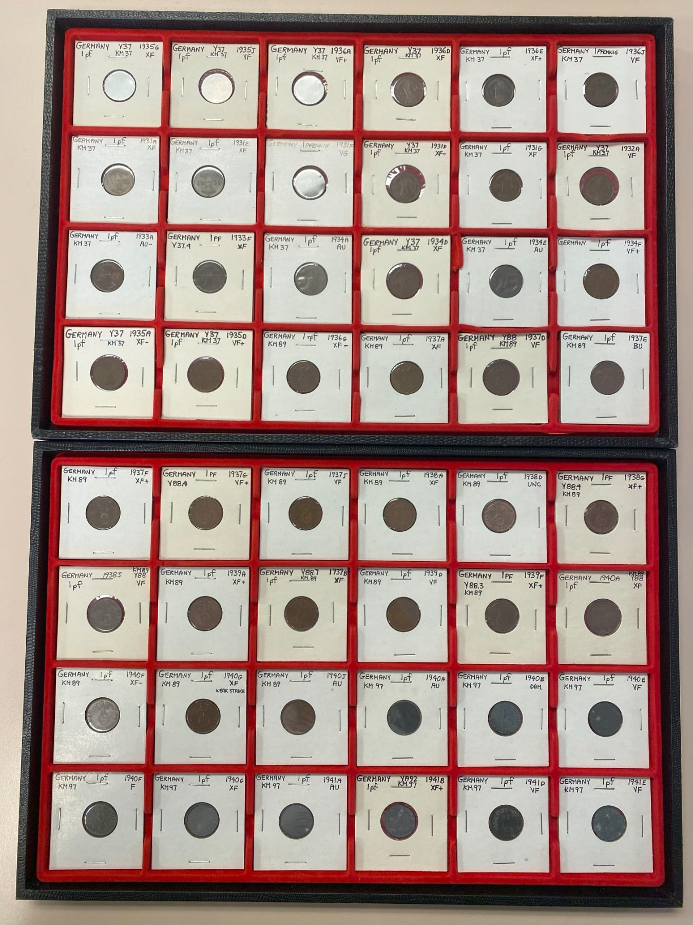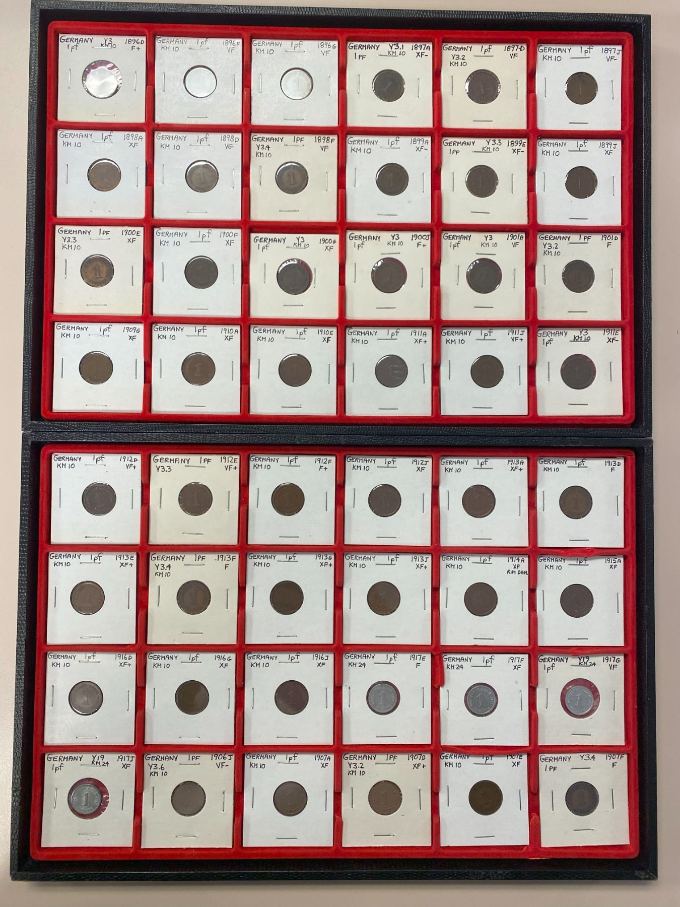 GERMANY: LOT of 175 coins, including Kaiserreich (75 pcs), Weimar Republic (41), Third Reich (49), Federal Republic (8), and two ca. 1800s rechenpfennigs; average circulated grades, as well as a few uncs, all 1 pfennigs, many dates/mintmarks, including some scarce to rare, in consignor's 2x2 holders, viewing recommended; retail value $800, lot of 175 pieces, ex Almer H. Orr III Collection.