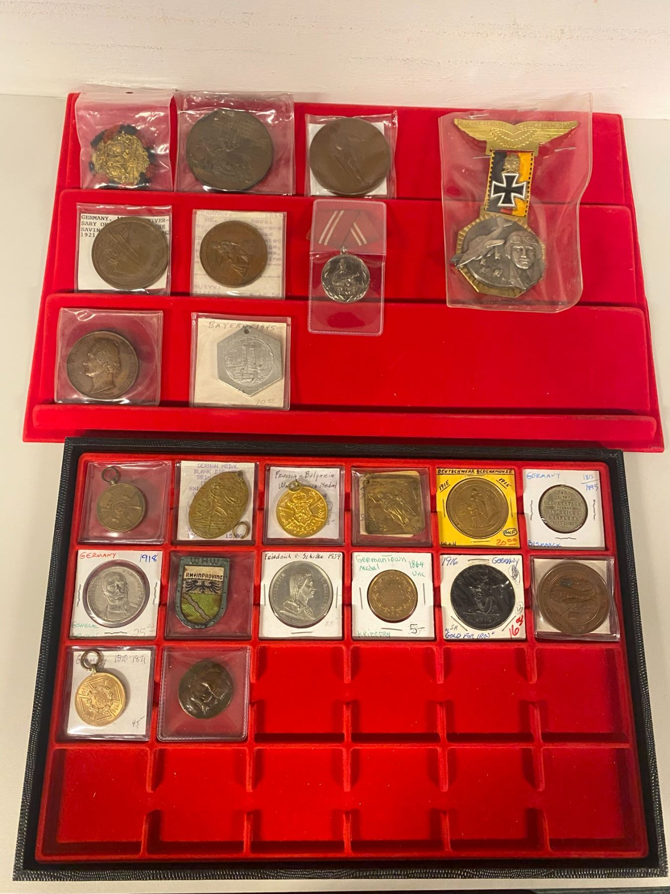 GERMANY: LOT of 24 medals, including 1836 AE 44mm Friedrich Cotta, 1839 Prussia AE 45mm 300th Anniversary of Berlin Reformation, 1844 AE 45mm German Railroad, 1849 AE 30mm Hohenzollern Commemorative, 1859 WM 37mm Schiller, 1864 AE 30mm Campaign Against Denmark, 1868 AE 43mm H.C. Meyer Company 50th Anniversary, 1871 gilt AE 29mm War Combatants, ND (ca. 1890?) gilt AE Deutsch Touren Club pinback with cloth ring, 1891 gilt AE 48x48mm square Peace // Niederwald Memorial, 1895 silvered brass 28mm Bismarck 80th Birthday, 1897 (Switzerland) AE 45mm Adrian von Bubenberg, 1914 AE 31mm Hindenburg // Bear, 1915 (United States) AE 38mm Deutschwehr Commemorative, 1916 AE 61mm Contribution medal, 1916 FE 39mm Donation medal, 1918 AE 47x31mm oval Hindenburg Quotation, 1918 gilt AE 32mm Prussia-Bulgaria War Service, 1918 FE 33mm General Ludendorff, 1921 AE 50mm Nurnberg Urban Savings Bank, ND (ca. 1940) WHW FE 42x30mm Rheinprovinz pinback badge, 1945 AL 41mm hexagonal Bavaria Munich City View holed, ND (ca. 1970?) DDR NI 32mm Loyal Service with ribbon, and 1977 base metal 61mm Hans-Ulrich Rudel with ribbon and wings; average circulated grades, including a few uncs, in consignor's holders, viewing recommended; retail value $800, lot of 24 pieces.