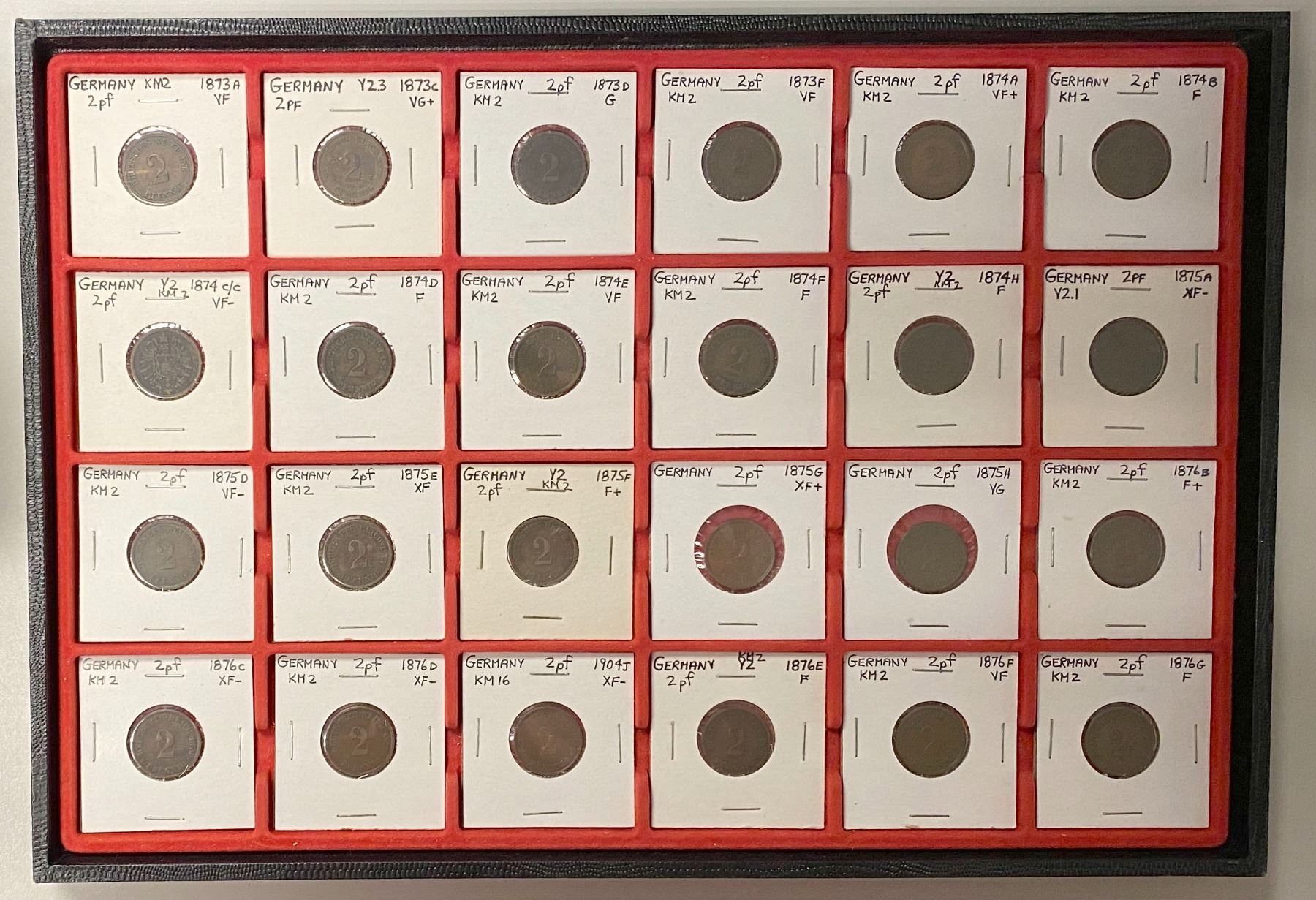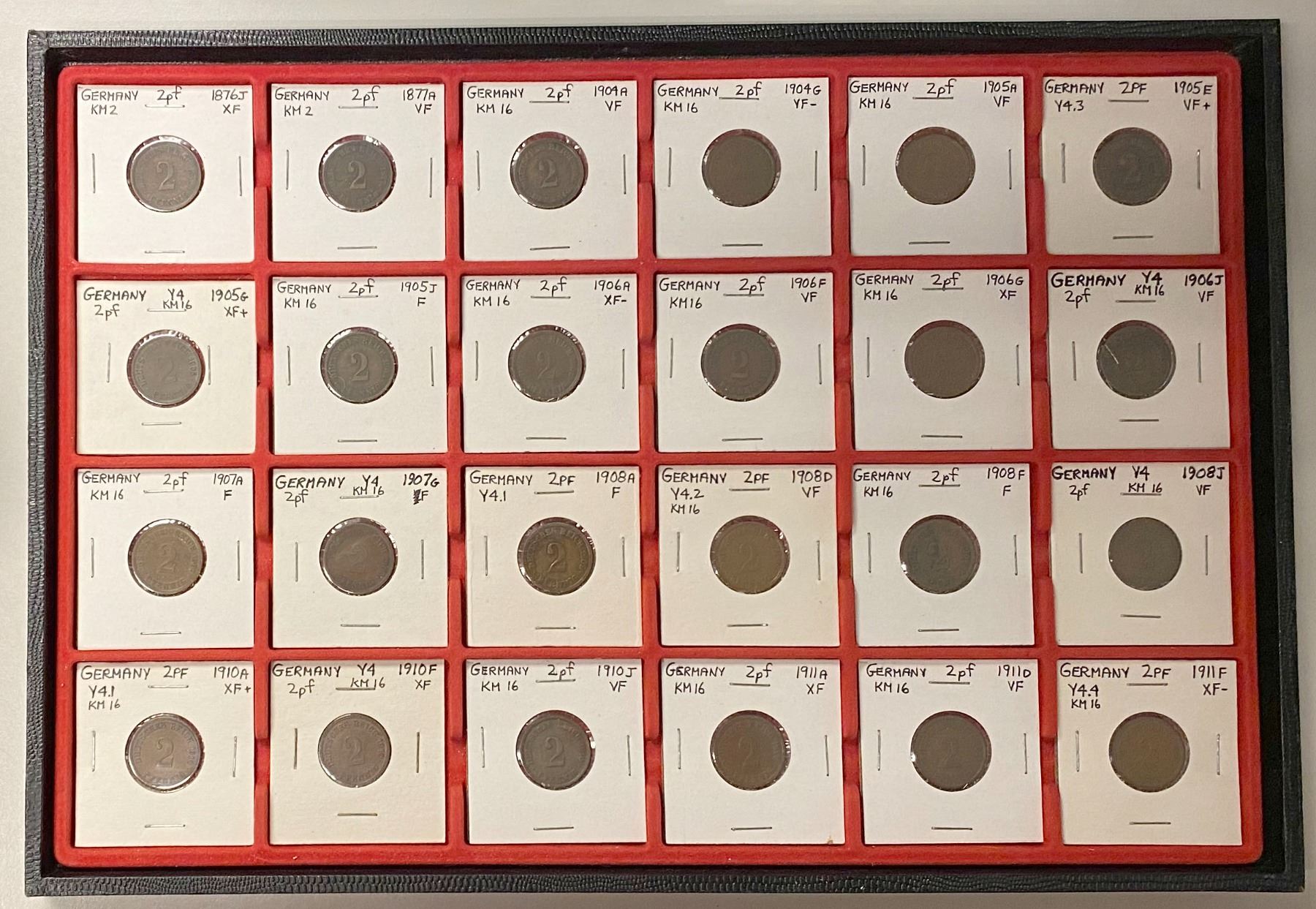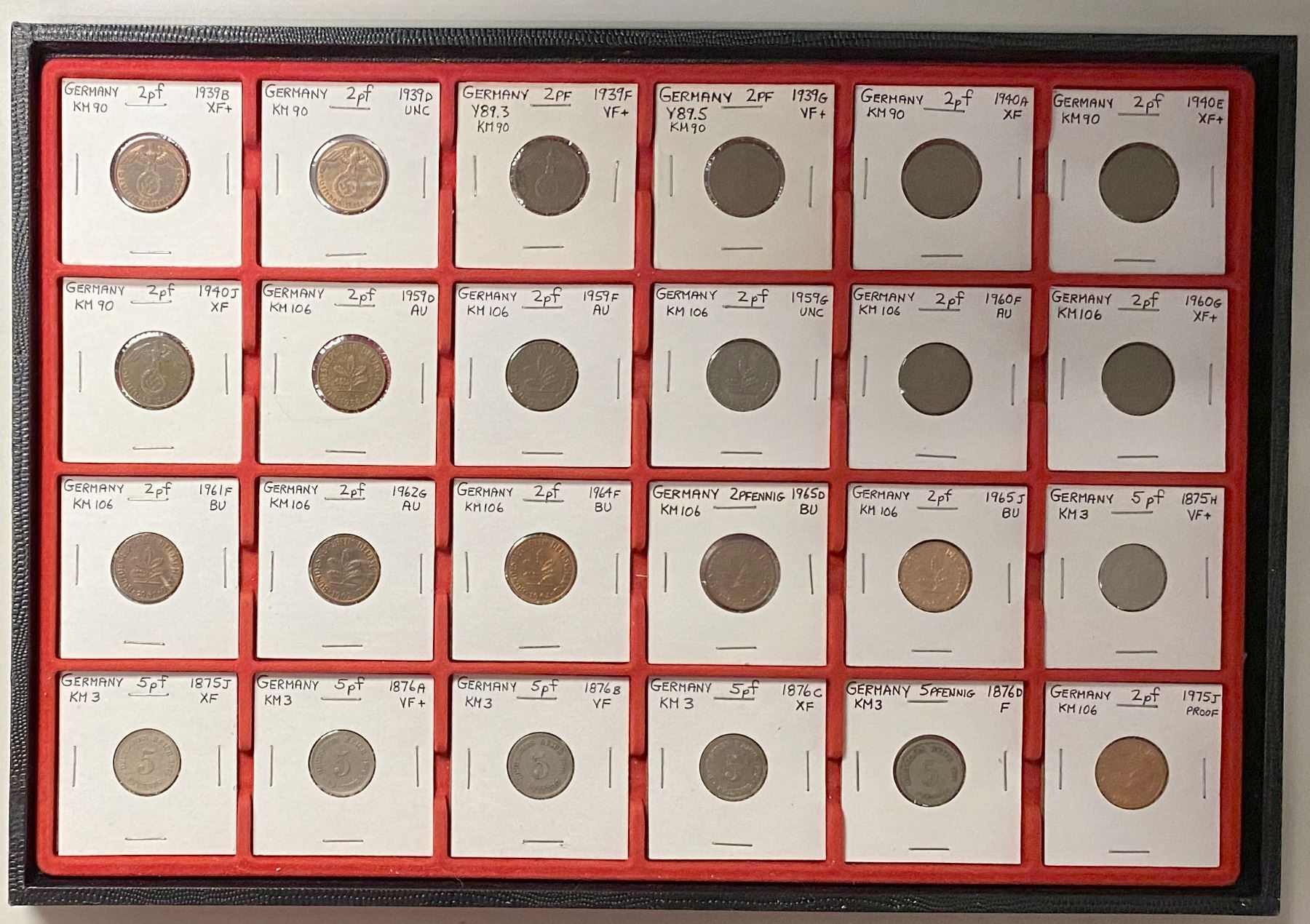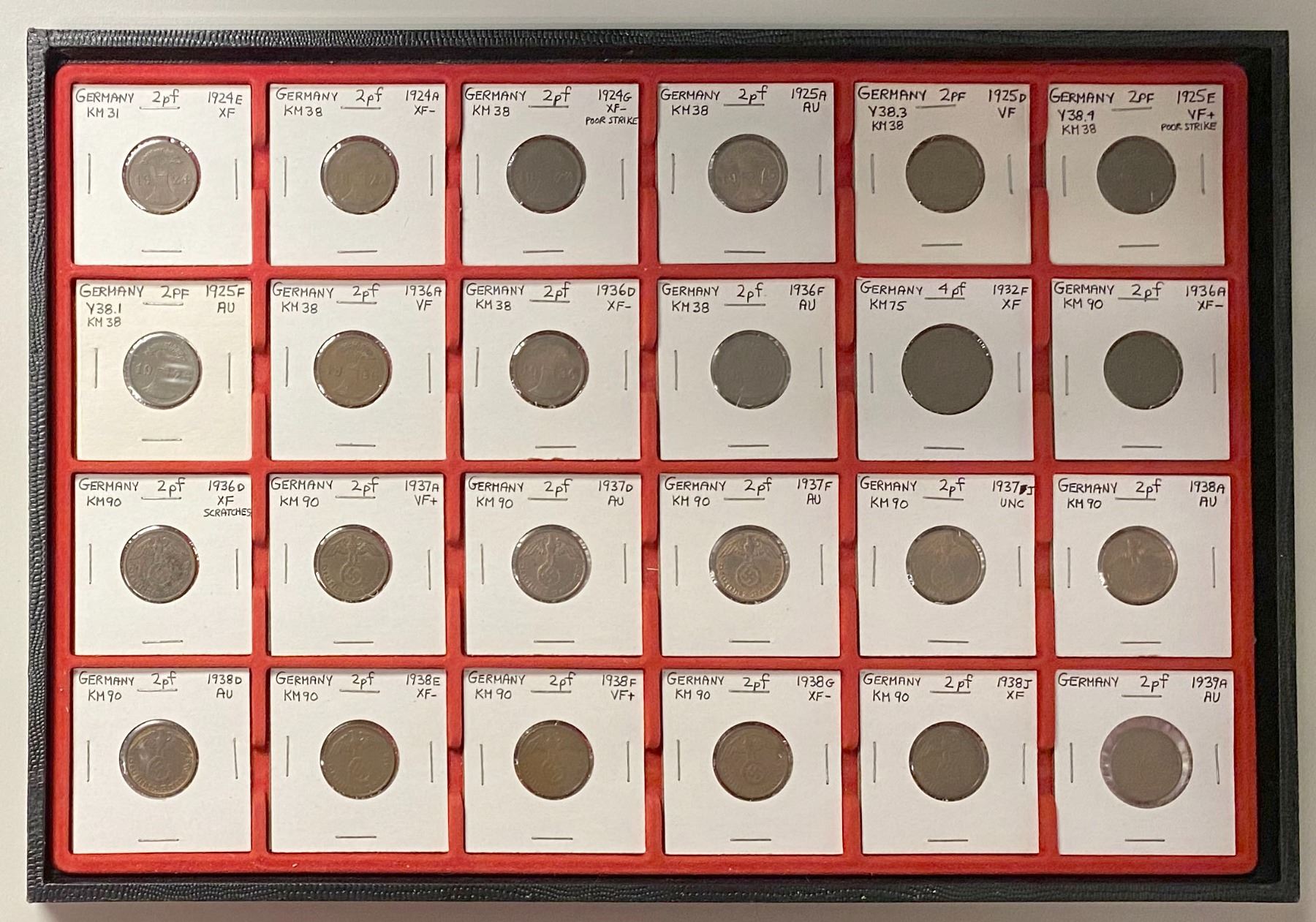 GERMANY: LOT of 242 coins, including Kaiserreich: 2 pfennig (64 pcs) and 5 pfennig (127); Weimar Republic: 2 rentenpfennig (8), 2 reichspfennig (10), and 4 reichspfennig (1); Third Reich: 2 reichspfennig (20); and Federal Republic (12); average circulated grades, as well as a few uncs, many date/mintmark combinations, little or no duplication, in consignor's holders, viewing recommended; retail value $1150, lot of 242 pieces, ex Almer H. Orr III Collection.