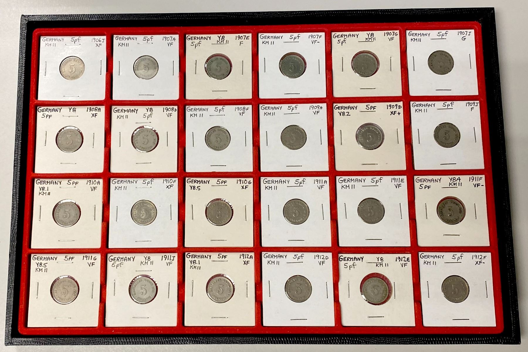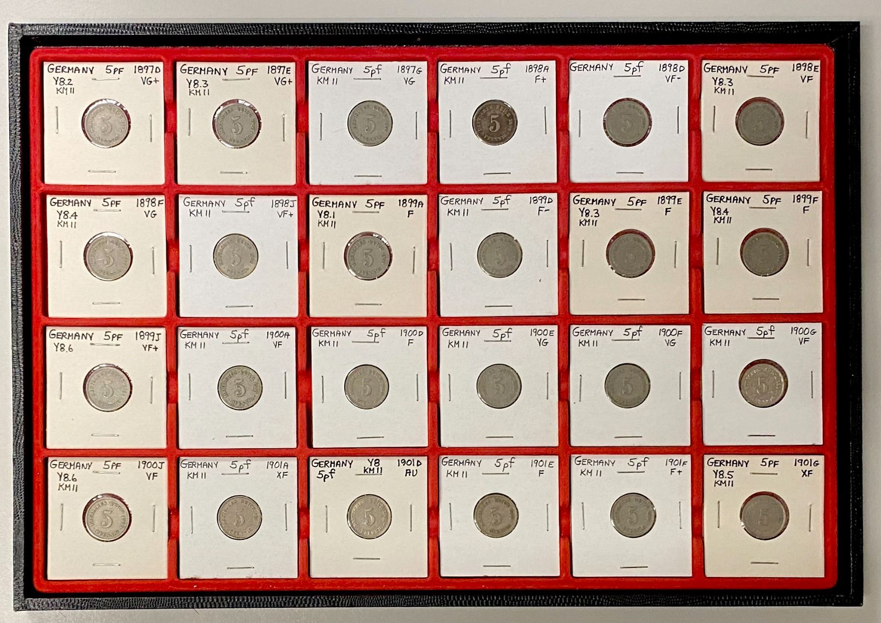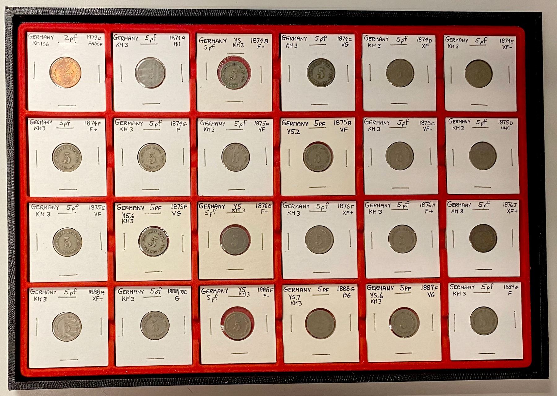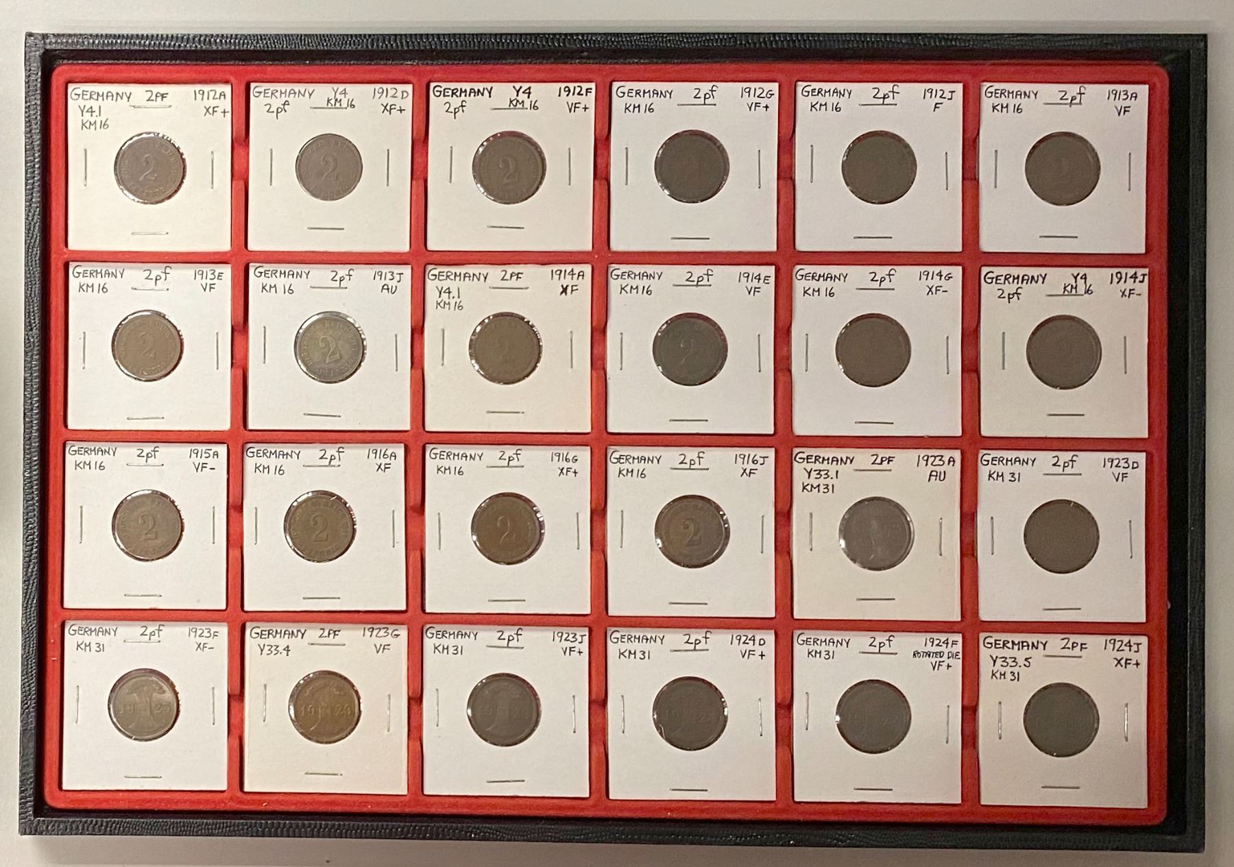 GERMANY: LOT of 242 coins, including Kaiserreich: 2 pfennig (64 pcs) and 5 pfennig (127); Weimar Republic: 2 rentenpfennig (8), 2 reichspfennig (10), and 4 reichspfennig (1); Third Reich: 2 reichspfennig (20); and Federal Republic (12); average circulated grades, as well as a few uncs, many date/mintmark combinations, little or no duplication, in consignor's holders, viewing recommended; retail value $1150, lot of 242 pieces, ex Almer H. Orr III Collection.