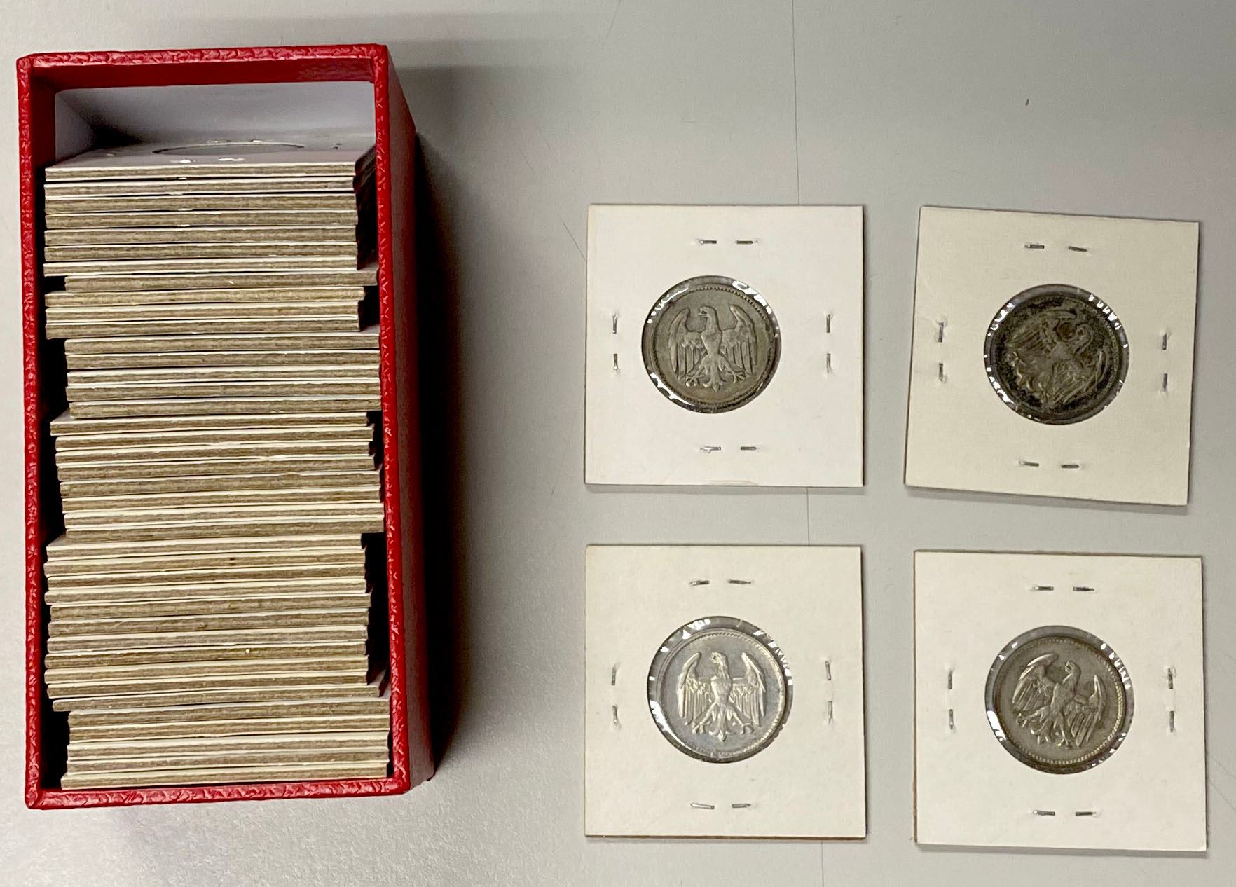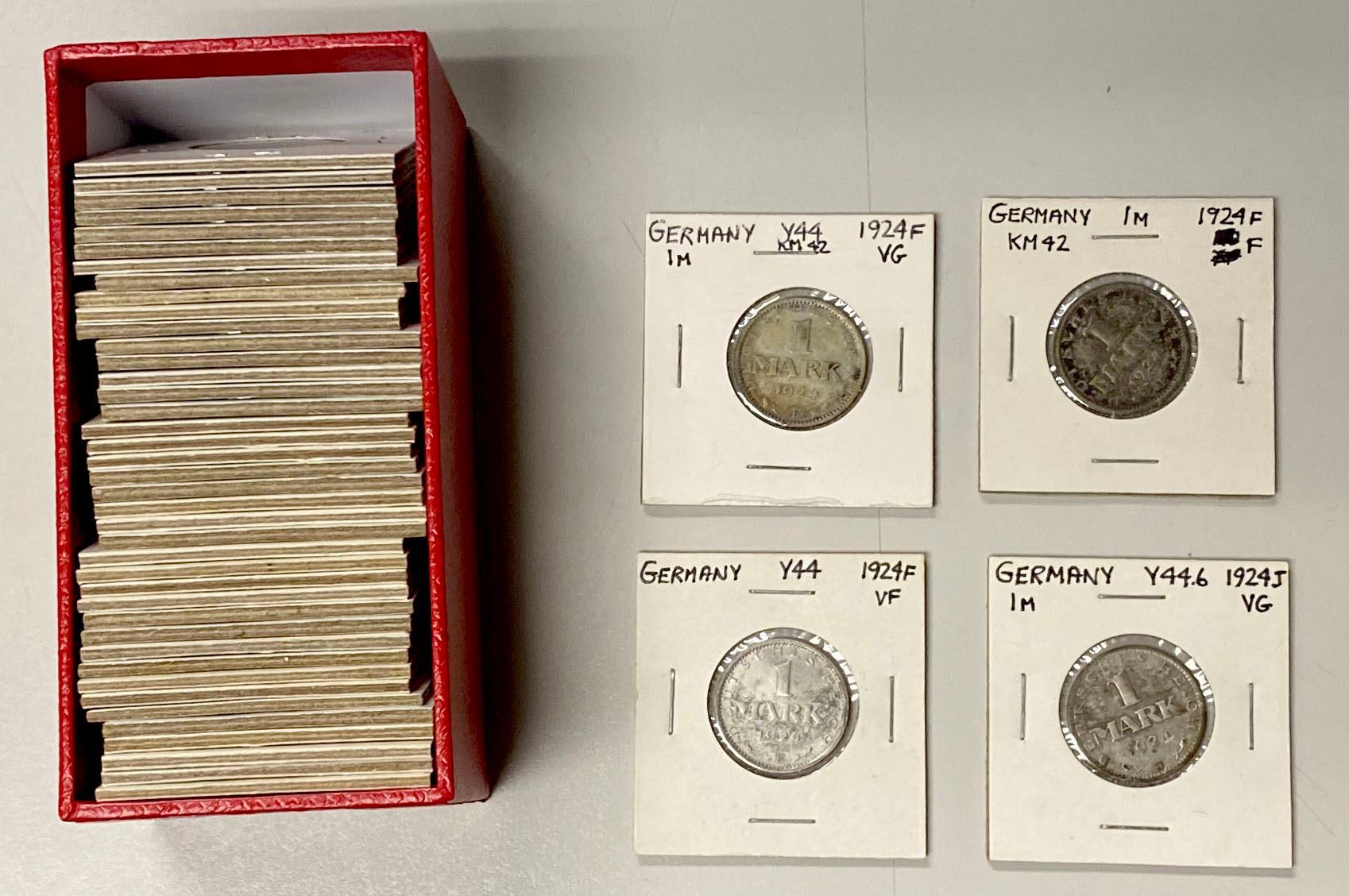 GERMANY: LOT of 44 coins, including mark: KM-14 (2 pcs, including 1916-F), KM-42 (10, including 1925-D [2]), KM-44 (13), and KM-78 (19, including 1933-G, 1935-J, 1936-F, 1936-G, 1937-J, and 1938-G); average circulated grades, with some better, most are silver, some duplication, but many different dates/mintmarks, in consignor's 2x2 holders, viewing recommended; retail value $1075, lot of 44 pieces, ex Almer H. Orr III Collection.