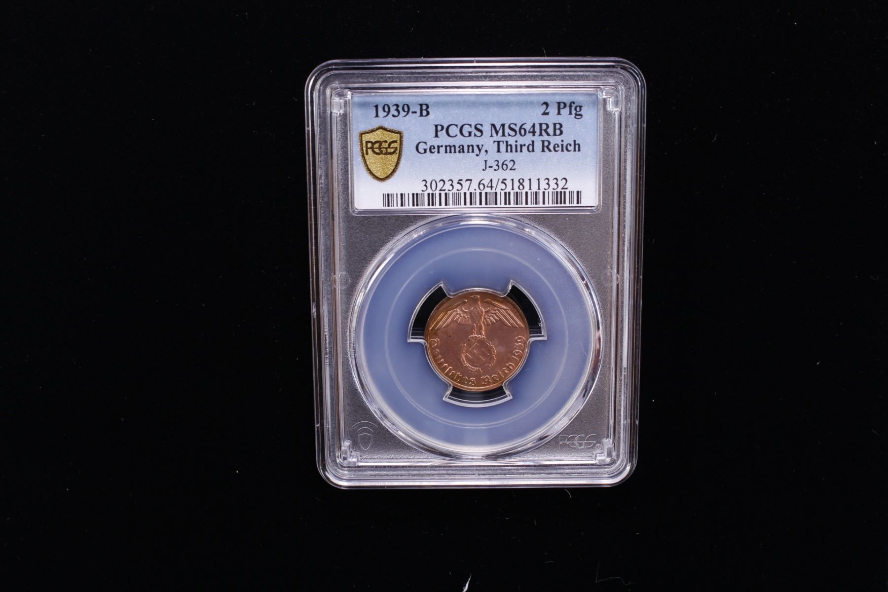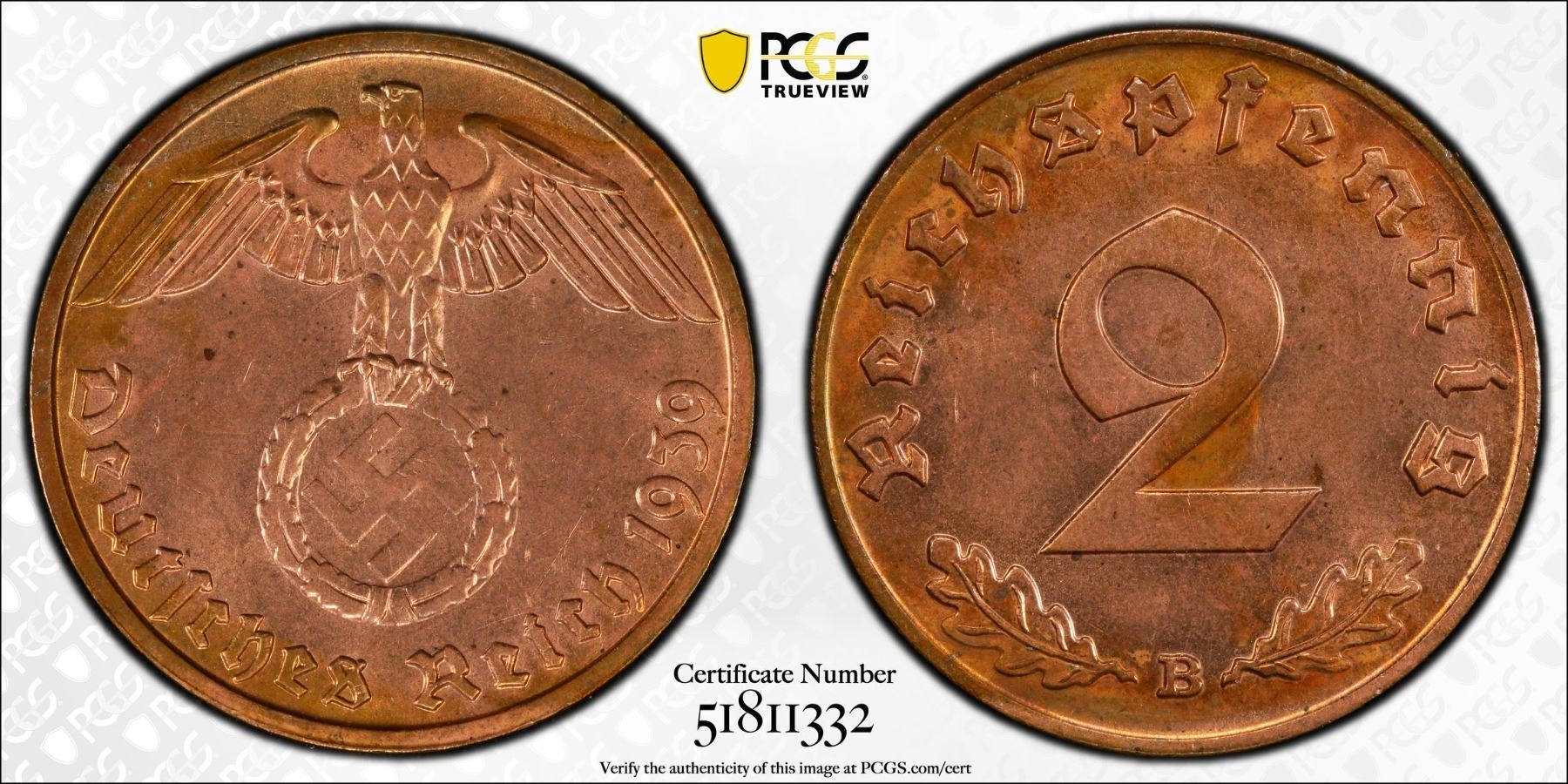 GERMANY: Third Reich, 1933-1945, AE 2 reichspfennig, 1939-B, PCGS MS64 RB