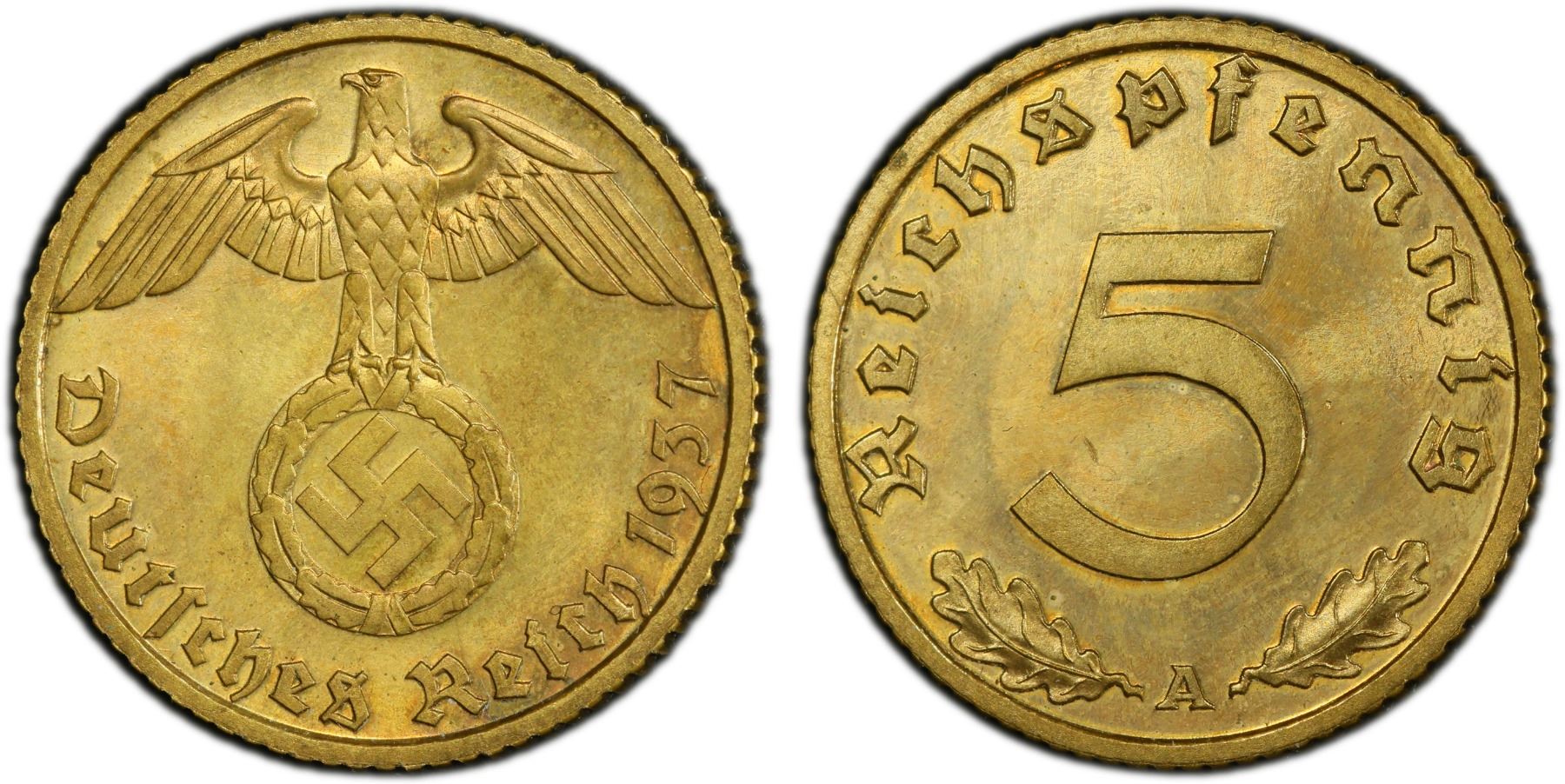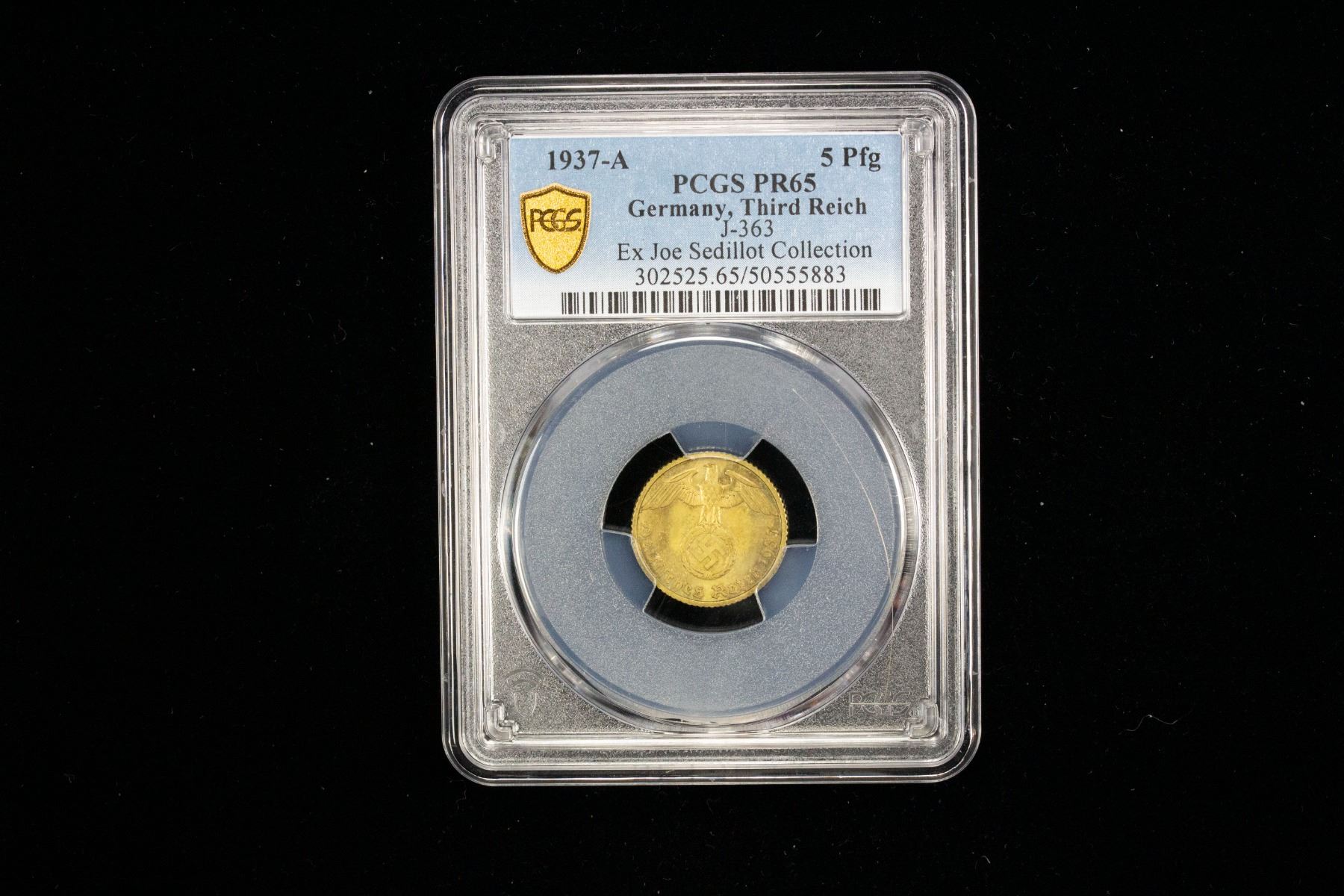 GERMANY: Third Reich, 5 reichspfennig, 1937-A, KM-91, Y-90, J-363, a superb proof quality example! PCGS graded Proof 65, ex Joe Sedillot Collection.