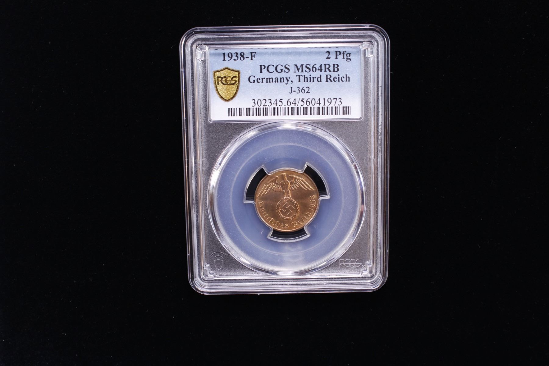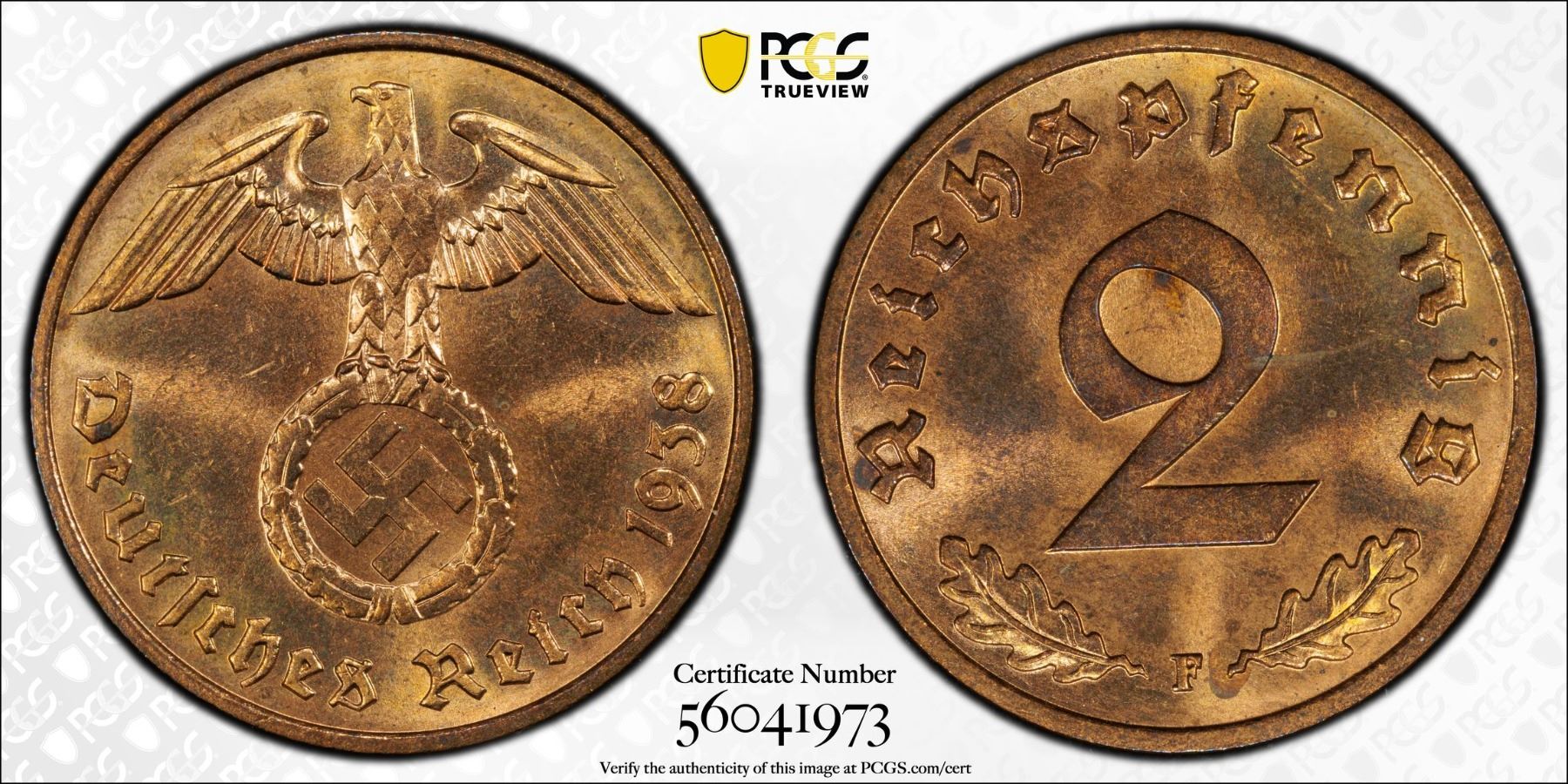 GERMANY: Third Reich, AE 2 reichspfennig, Stuttgart, 1938-F, KM-90, Jaeger-362, superb luster, nearly full red, PCGS graded MS64 RB.