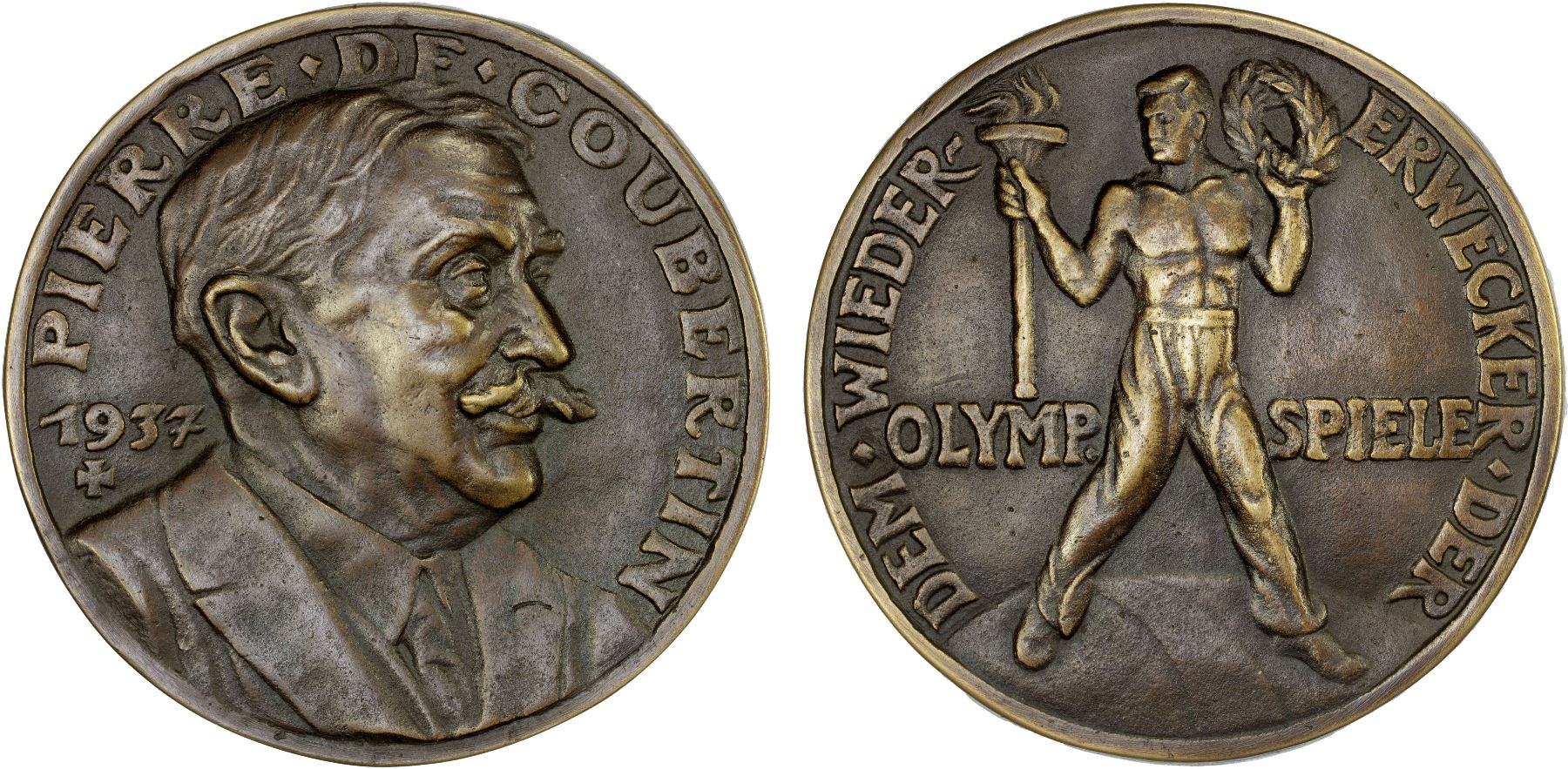 GERMANY: Third Reich, AE medal (333.76g), 1937, Kienast-537, 88mm cast bronze medal on the Death of Pierre Coubertin by Karl Goetz, half-length portrait mostly right with PIERRE DE COUBERTIN around and "1937 / +" in left field // man with lit torch and laurel wreath with OLYMP. - SPIELE at sides and DEM WIEDER- - ERWECKER DER around, KGOETZ on edge, VF. Pierre de Coubertin was the founder of the modern Olympic Games.