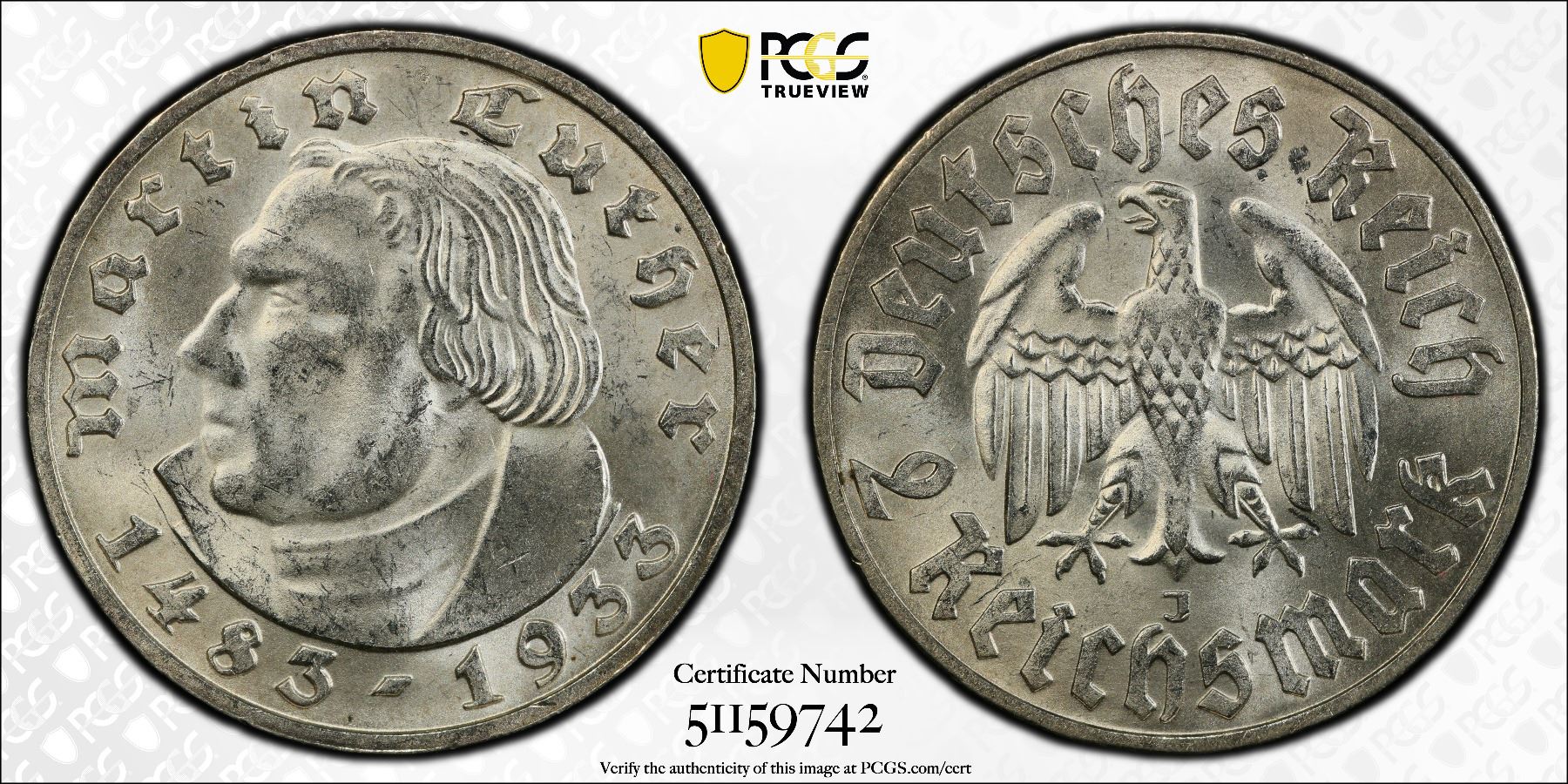 GERMANY: Third Reich, AR 2 mark, 1933-J, KM-79, Y-78, J-352, 450th Anniversary of Birth of Martin Luther, a lovely example, PCGS graded MS63.