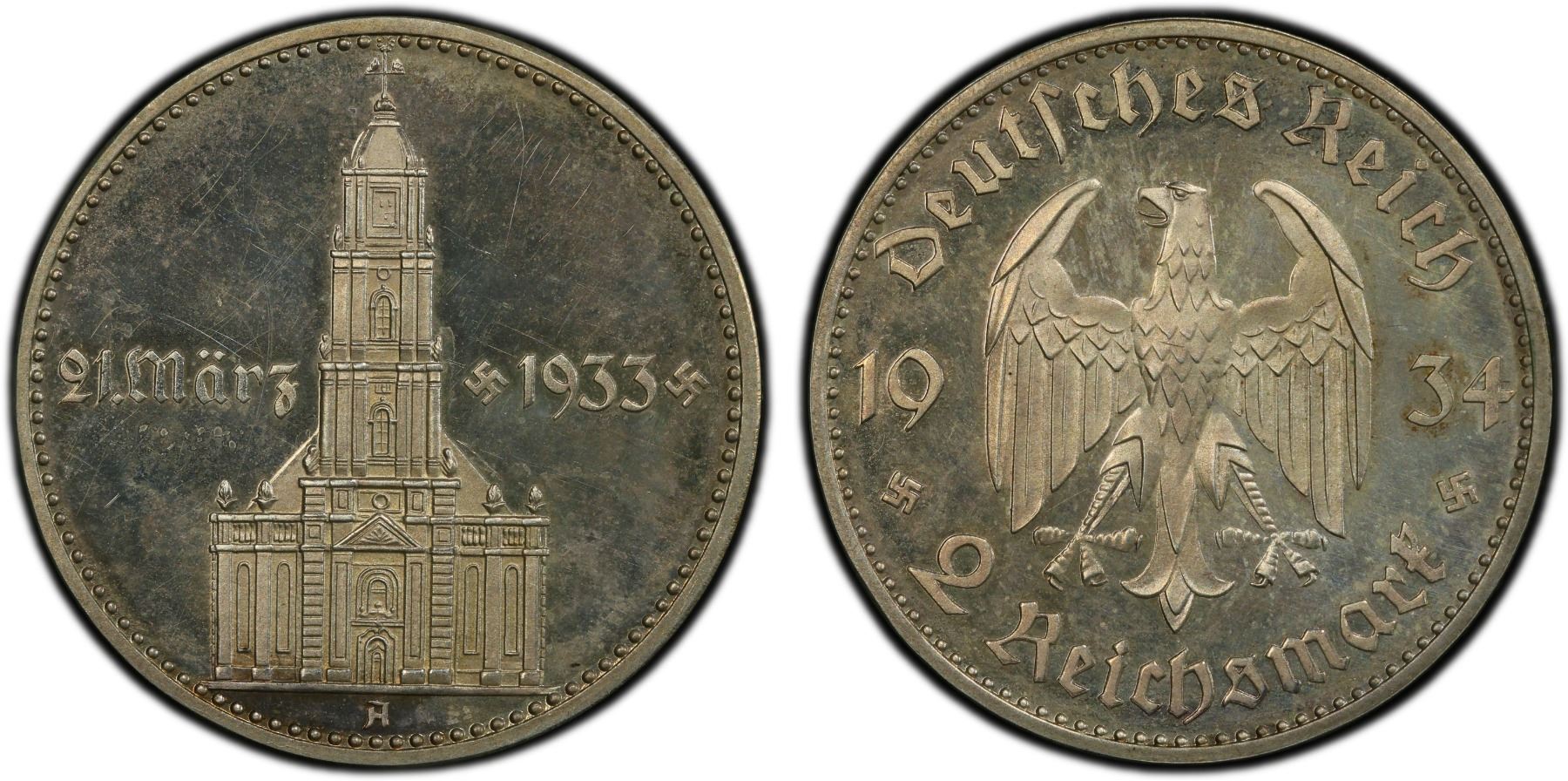GERMANY: Third Reich, AR 2 reichsmark, 1934-A, KM-81, Y-83, J-355, Potsdam Garrison Church, a wonderful reflective proof example! PCGS graded Proof 64 CAM, ex Joe Sedillot Collection. The Garrison Church was a Protestant church in the historic center of Potsdam. Built by order of King Frederich Wilhelm I of Prussia according to plans by Philipp Gerlach from 1730 to 1735, it was considered as a major work of Prussian Baroque architecture.