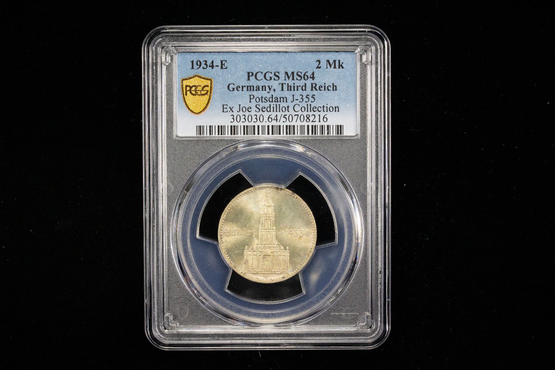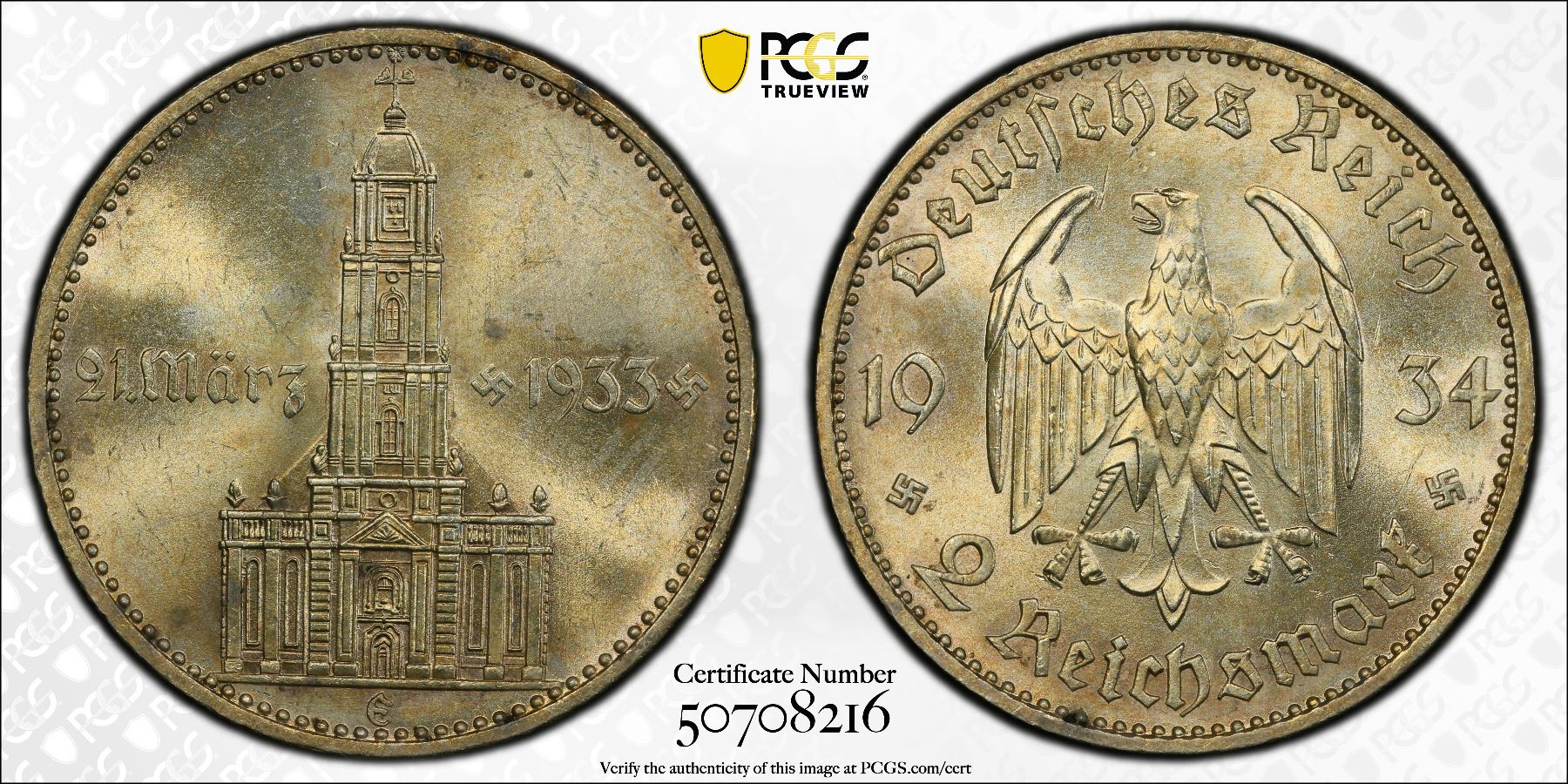 GERMANY: Third Reich, AR 2 reichsmark, 1934-E, KM-81, Y-83, J-355, First Anniversary of Nazi Rule - Potsdam Garrison Church, a wonderful lustrous example! PCGS graded MS64, ex Joe Sedillot Collection.