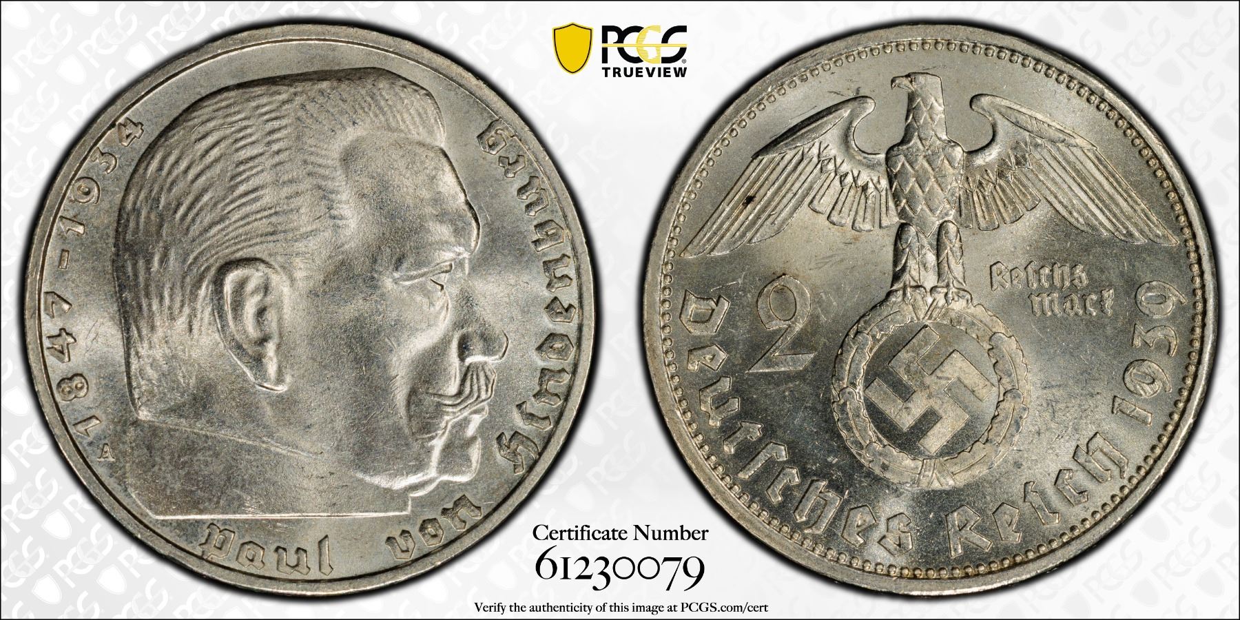 GERMANY: Third Reich, AR 2 reichsmark, 1939-A, KM-93, J-366, Paul von Hindenburg 1847-1934, a wonderful lustrous example! PCGS graded MS63.