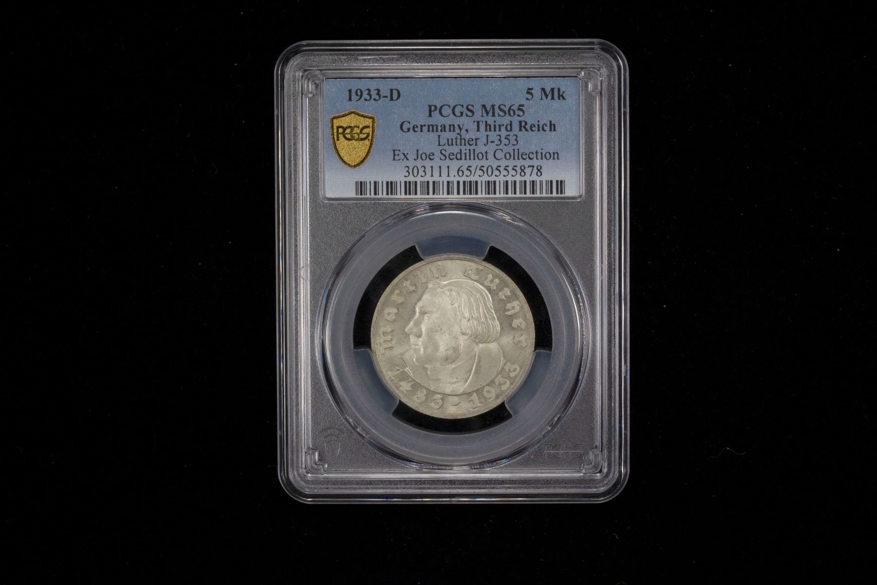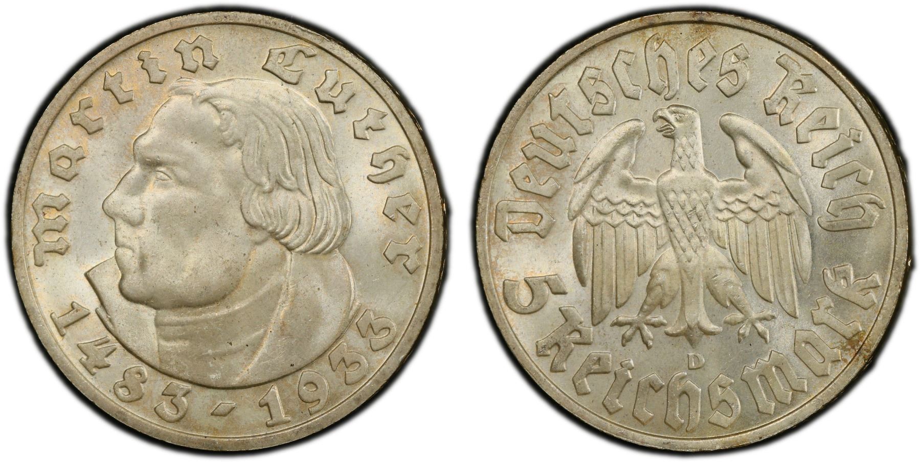 GERMANY: Third Reich, AR 5 reichsmark, 1933-D, KM-80, Y-79, J-353, 450th Anniversary of Martin Luther's Birth, a superb lustrous gem mint state example, PCGS graded MS65, ex Joe Sedillot Collection.