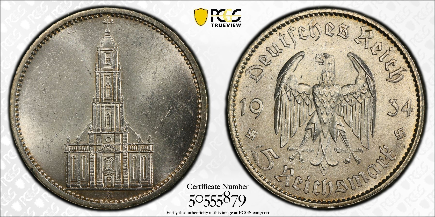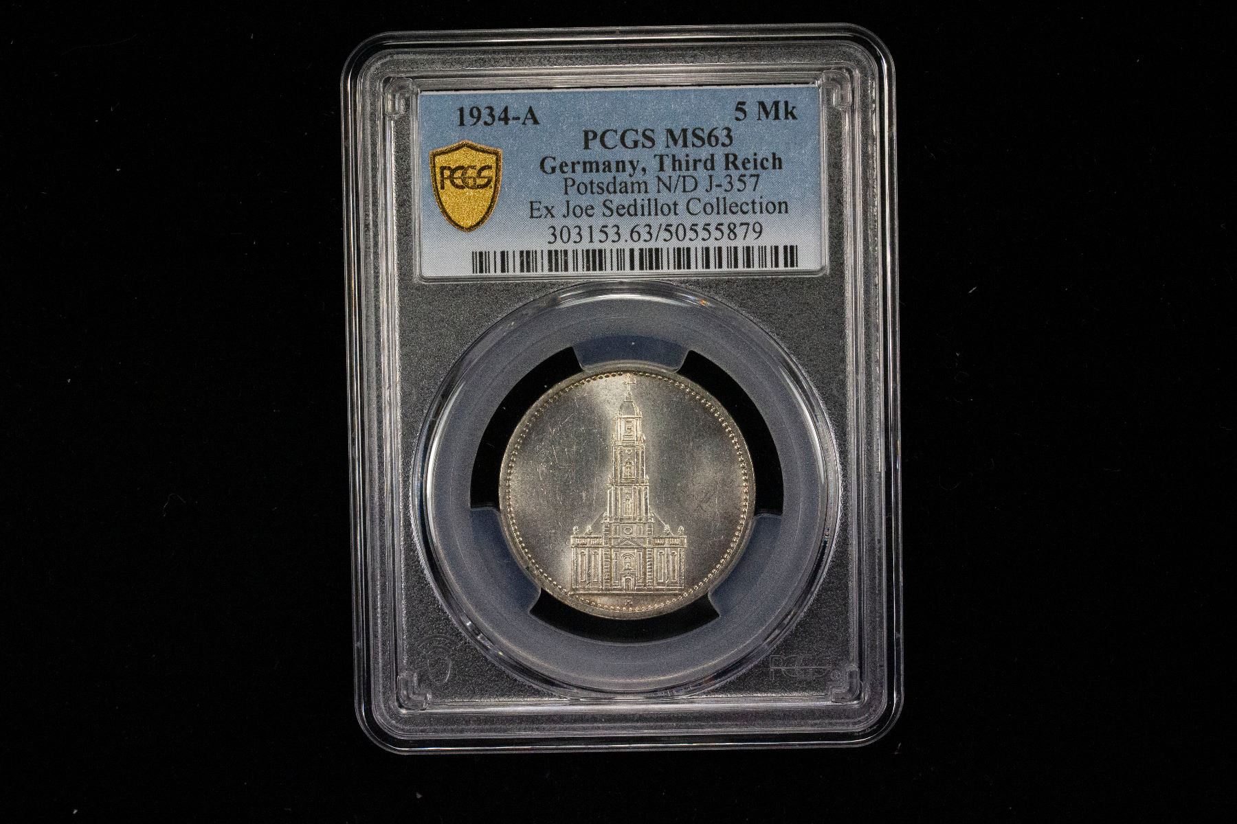 GERMANY: Third Reich, AR 5 reichsmark, 1934-A, KM-83, Y-85, J-357, Potsdam Garrison Church, a lovely lustrous example! PCGS graded MS63, ex Joe Sedillot Collection.