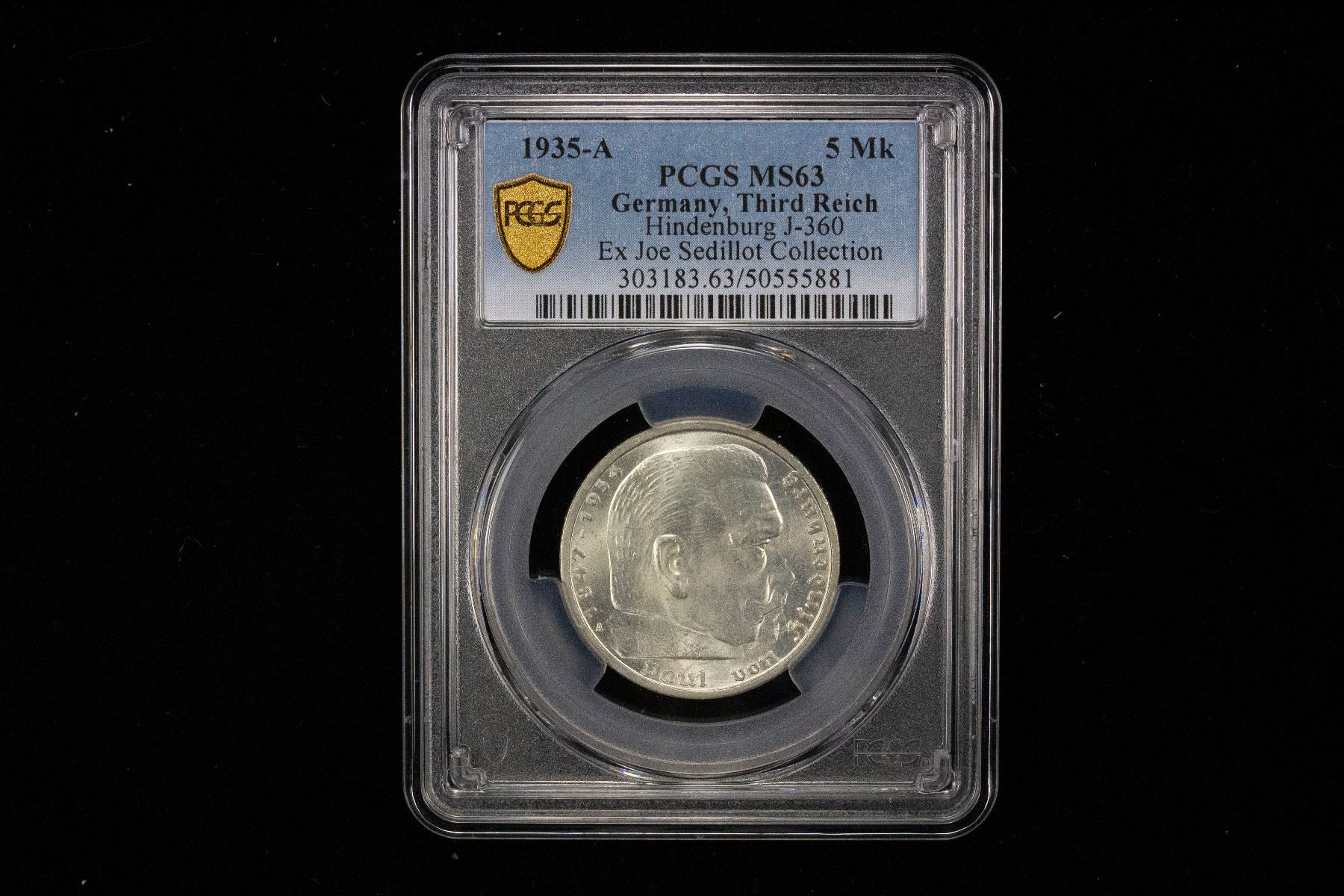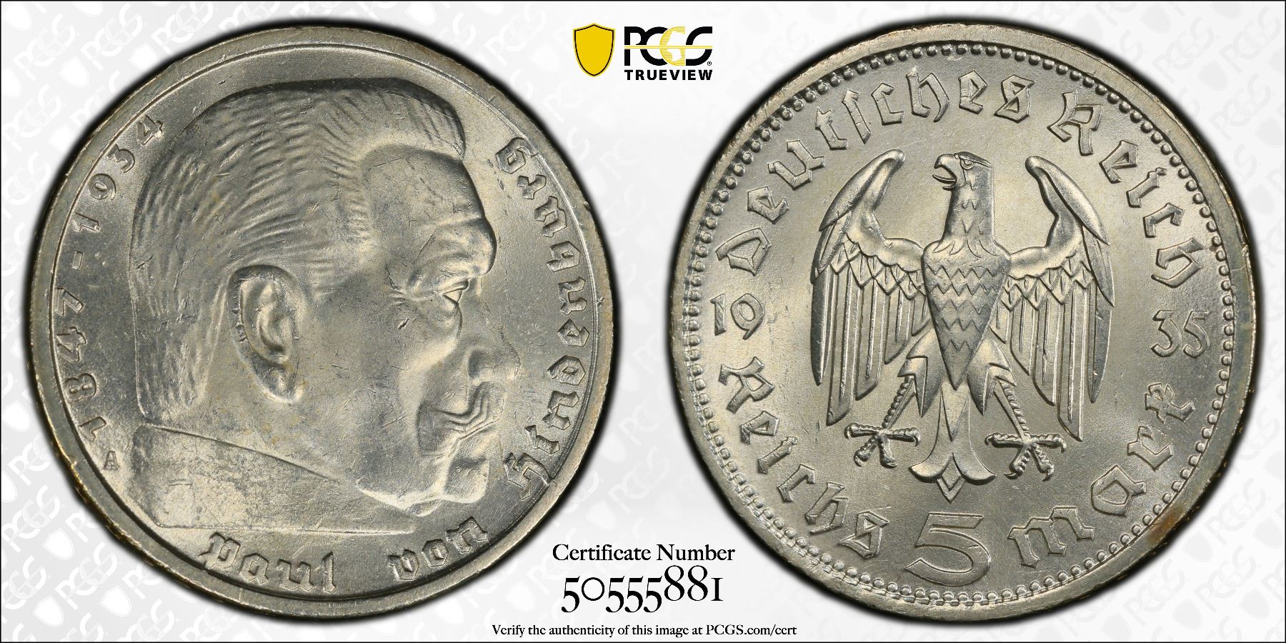 GERMANY: Third Reich, AR 5 reichsmark, 1935-A, KM-86, Y-82, J-360, Paul von Hindenburg, a lovely lustrous example! PCGS graded MS63, ex Joe Sedillot Collection.
