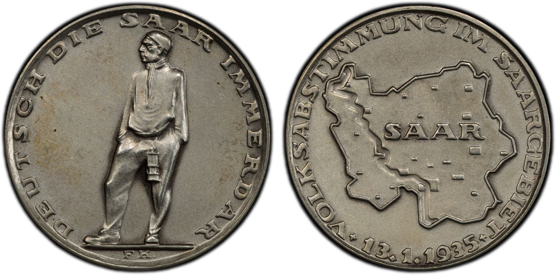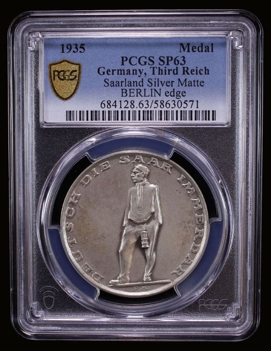 GERMANY: Third Reich, AR medal, 1935, 36mm silver medal by Fritz Koelle commemorating the 1935 Saarland Reunification; DEUTSCH DIE SAAR IMMERDAR and miner with safety lamp // "VOLKSABSTIMMUNG IM SAARGEBIET 13.1.1935" with stylized map of the Saar region, 835 PR. MÜNZE BERLIN on edge, matte finish, a lovely specimen quality example! PCGS graded Specimen 63.