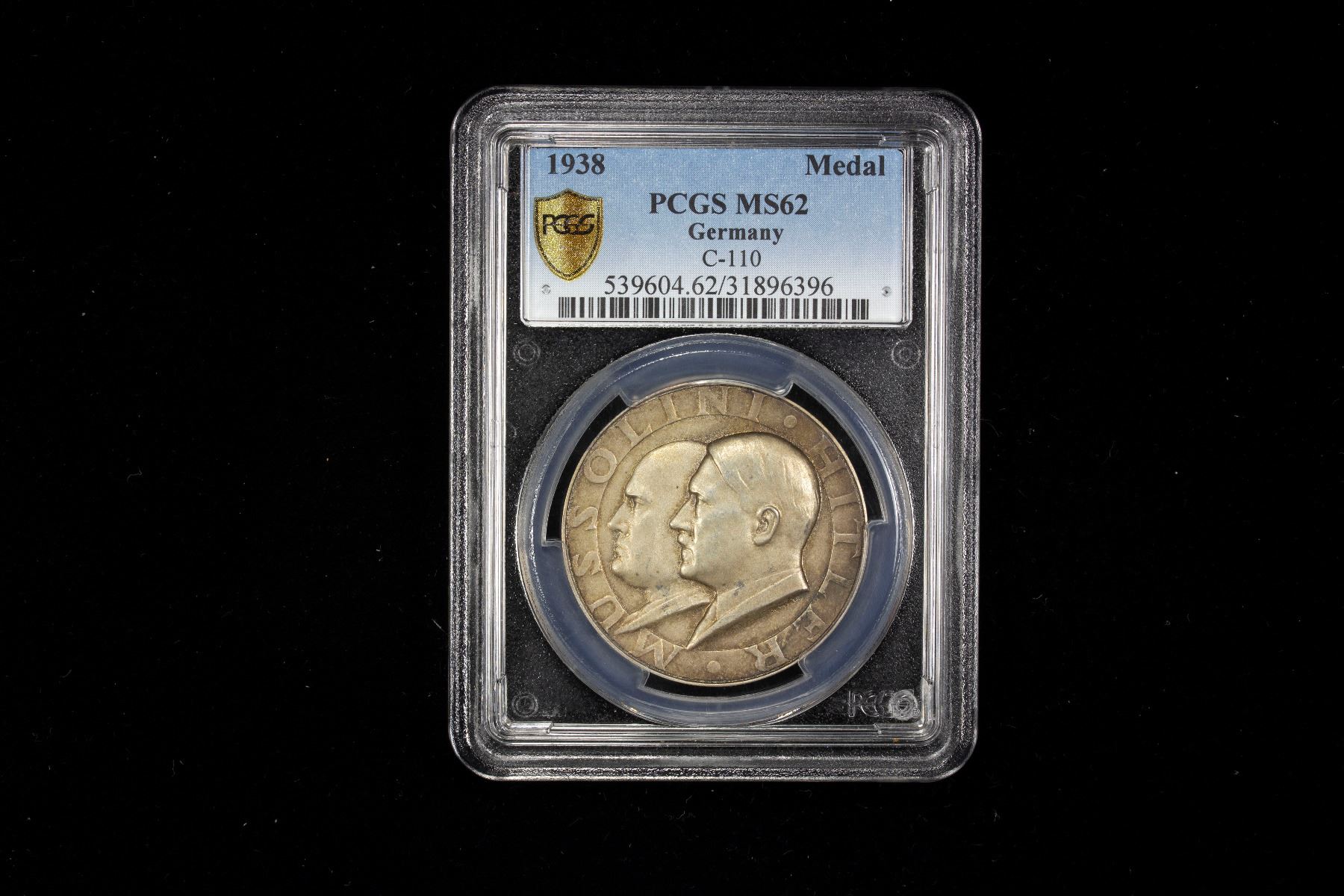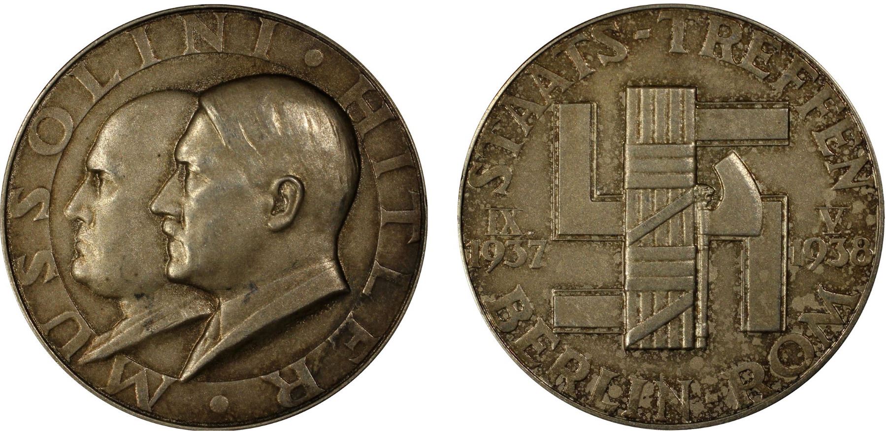 GERMANY: Third Reich, AR medal, 1938, Colbert-Hyder-110, 36mm silver medal by F. Beyer for the State Meeting of Hitler and Mussolini; MUSSOLINI / HITLER around conjoined busts of Adolf Hitler and Benito Mussolini // STAATS TREFFEN / BERLIN ROMA around Italian fasces superimposed on the National-Socialist German swastika "IX / 1937" and "V / 1938" either side, "835 PR. MUNZE BERLIN" on edge, a lightly toned matte finish example, PCGS graded MS62. Struck by the Prussian State Mint to commemorate the meetings held between Hitler and Mussolini in Rome and Berlin over the course of 1937 and 1938.
