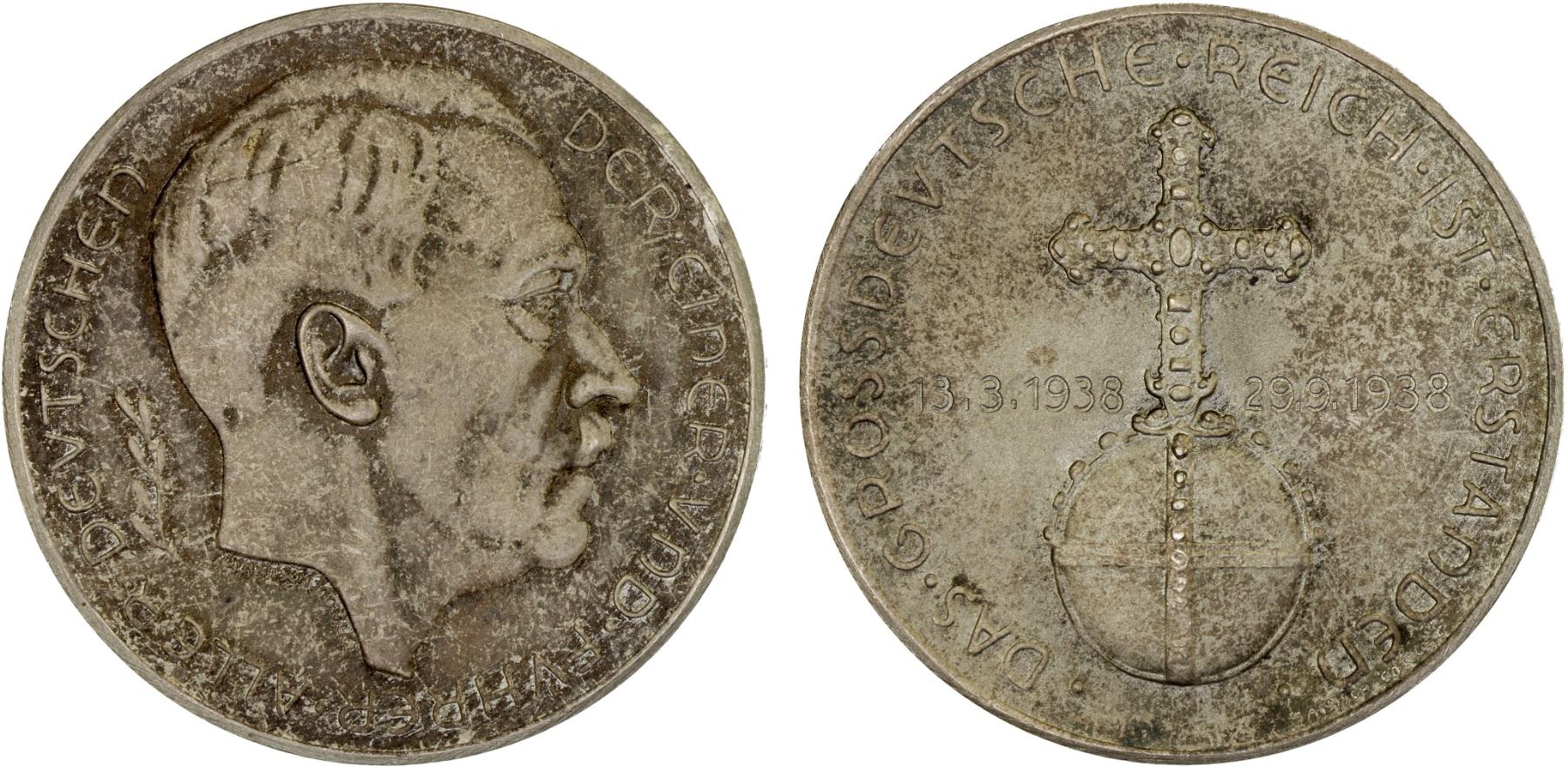 GERMANY: Third Reich, AR medal (21.63g), 1939, Colbert & Hyder-114, 36mm silver medal by H. E. Hanisch and Concée for the Creation of the "Greater German Reich" through the Annexation of Austria and the Sudetenland, struck at the Hauptmünzamt, Wien (Vienna Mint); DER EINER UND FÜHRER ALLER DEUTSCHEN around bust of Adolf Hitler right, maker's name below // DAS GROSSDEVTSCHE REICH IST ERSTANDEN around the Imperial Orb of the Holy Roman Empire, dates 13.3.1938 / 29.9.1938 across field, maker's name at lower right, edge stamped with "835" [silver] on edge, matte finish, Choice XF. This item was originally produced by a regime which perpetrated crimes against humanity, war crimes, mass murder, and other acts of violence. Our firm does not endorse such activities and only offers this item as an artifact of history to further research and civil enlightenment.