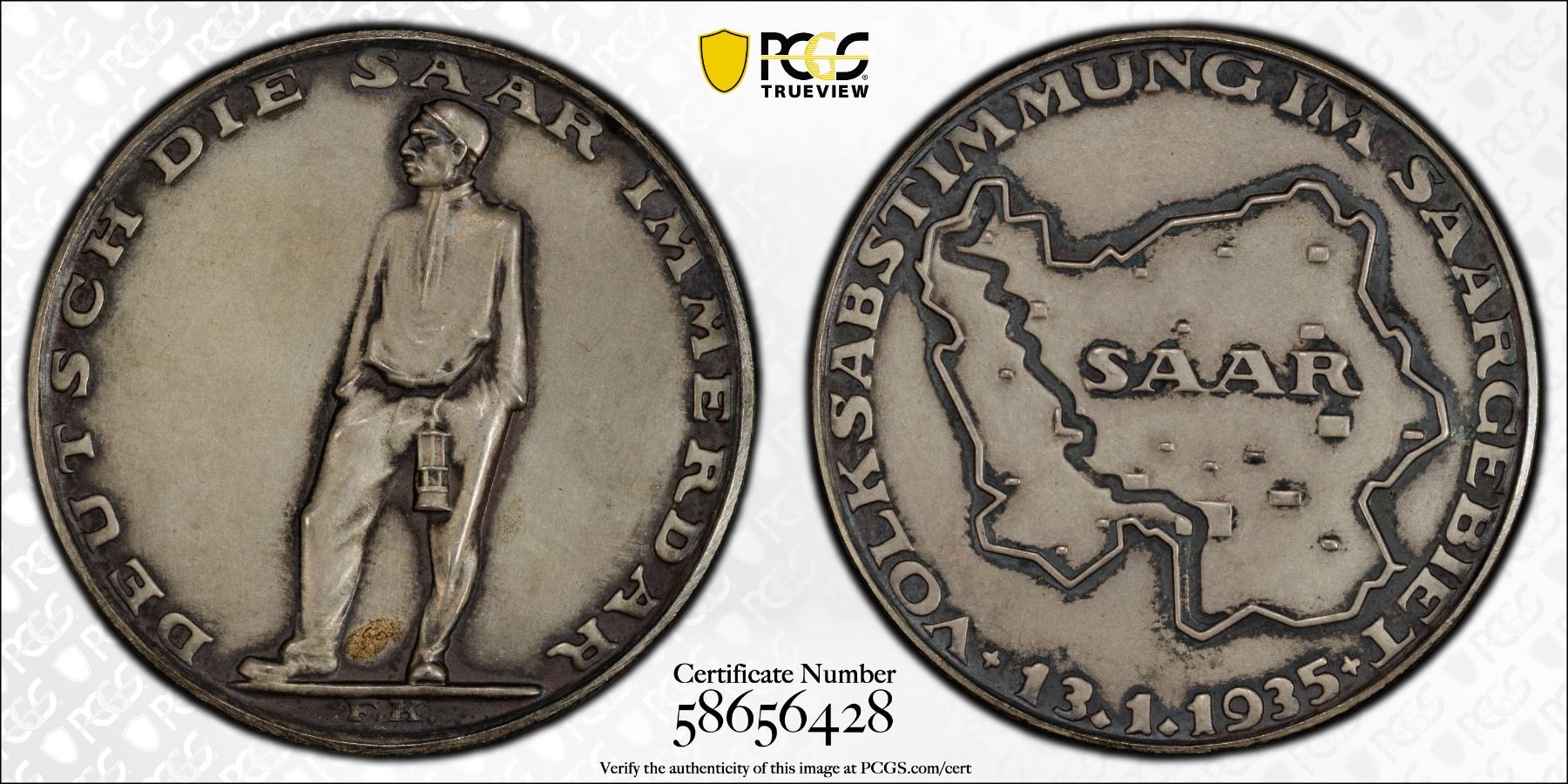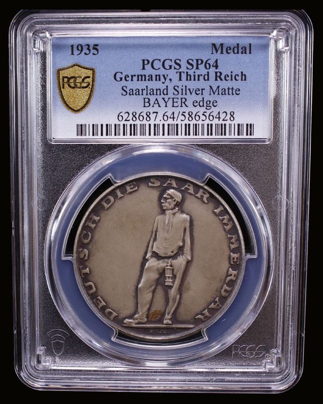 GERMANY: Third Reich, AR medal (21.77g), 1935, 35mm silver medal by Müseler for the Saarland Plebiscite; DEUTSCH DIE SAAR IMMERDAR around miner with safety lamp // "VOLKSABSTIMMUNG IM SAARGEBIET / 13.1.1935" around stylized map of the Saar region inscribed SAAR, BAYER HAUPTMÜNZAMT FEINSILBER on edge, matte finish, a wonderful specimen quality example! PCGS graded Specimen 64.