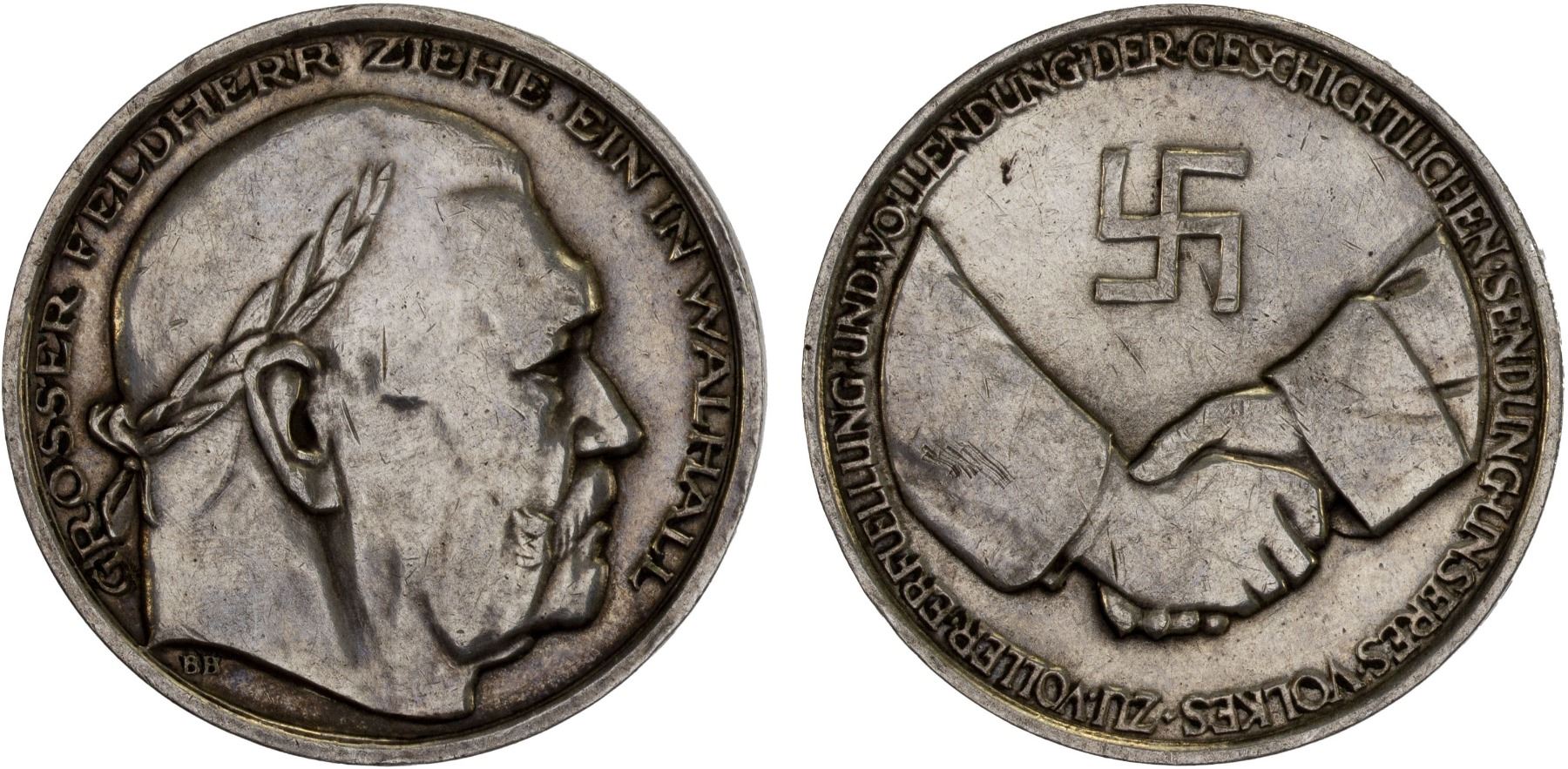 GERMANY: Third Reich, AR medal (21.92g), Munich, ND (1934), 36mm .999 fine silver medal on the Death of Paul von Hindenburg by B. Bleeker, laureathe bust right with GROSSER FELDHERR ZIEHE EIN IN VALHALL around // swastika above clasped hands with ZU VOLLER ERFUELLUNG UND VOLLENBUNG DER GESCHICHTLICHEN SENDUNG UNSERES VOLKES around, lightly cleaned, BAYER HAUPTMÜNZAMT FEINSILBER on edge, Proof.