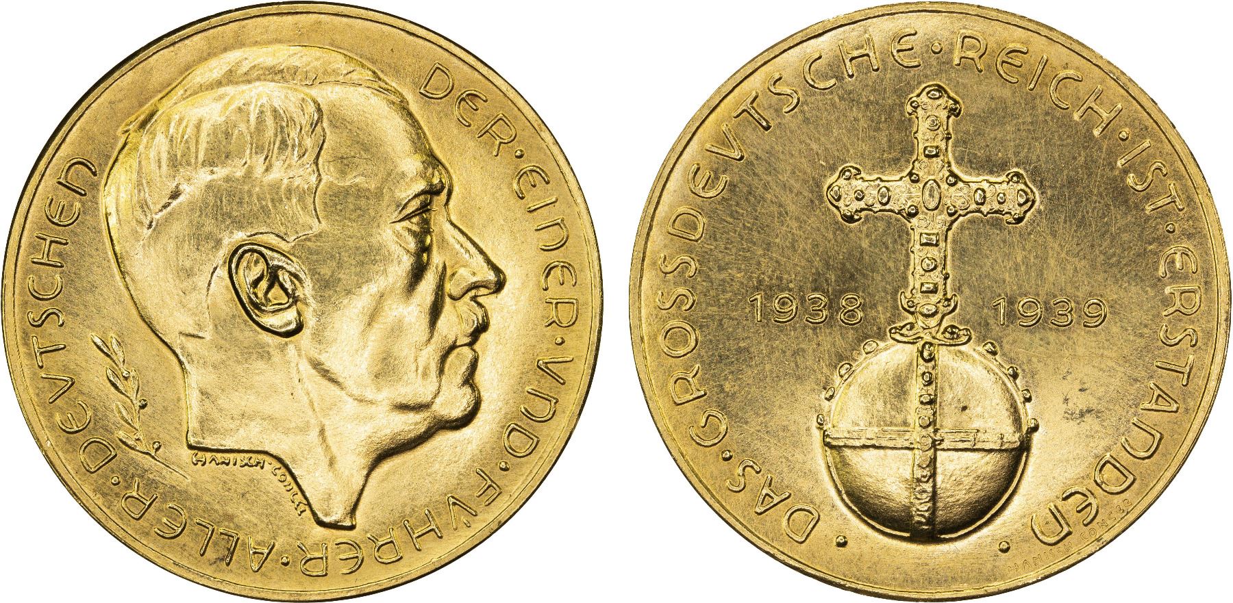 GERMANY: Third Reich, AV medal (33.09g), 1939, cf. Colbert/Hyder-C116, 36mm gold medal by H. E. Hanisch and Concée for the Creation of the "Greater German Reich" through the Annexation of Austria and the Sudetenland; DER EINER UND FÜHRER ALLER DEUTSCHEN around bust of Adolf Hitler right, maker's name below // DAS GROSSDEVTSCHE REICH IST ERSTANDEN around the Imperial Orb of the Holy Roman Empire, date 1938 / 1939 either side, maker's name at lower right, marked 986 [gold] on edge, likely struck at the Hauptmünzamt, Wien (Vienna Mint), faint surface hairlines, a very rarely offered medal of this type in gold! Unc. This item was originally produced by a regime which perpetrated crimes against humanity, war crimes, mass murder, and other acts of violence. Our firm does not endorse such activities and only offers this item as an artifact of history to further research and civil enlightenment.