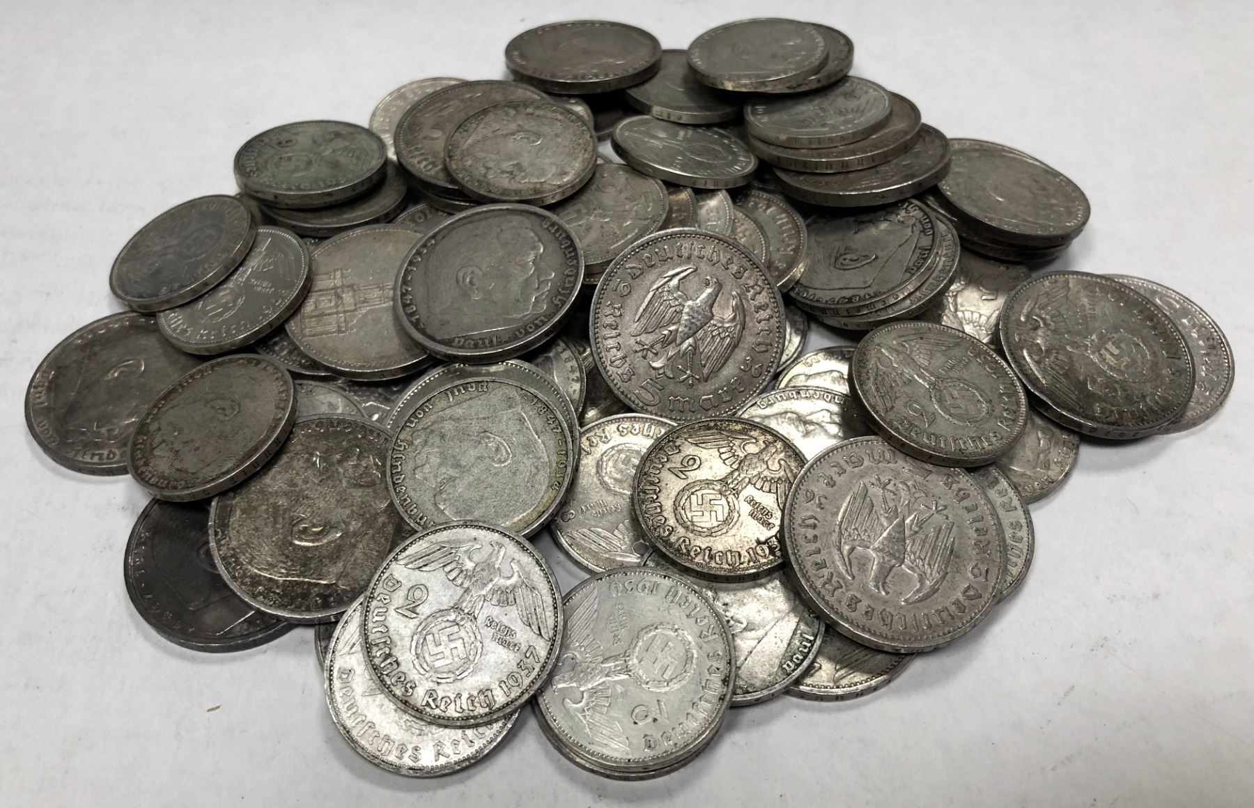 GERMANY: Third Reich, LOT of 69 Third Reich silver 2 mark swastika types (42), and silver 5 marks with Hindenburg, swastika, and Potsdam Church types (27), average circulated quality, retail value $525, lot of 69 coins.