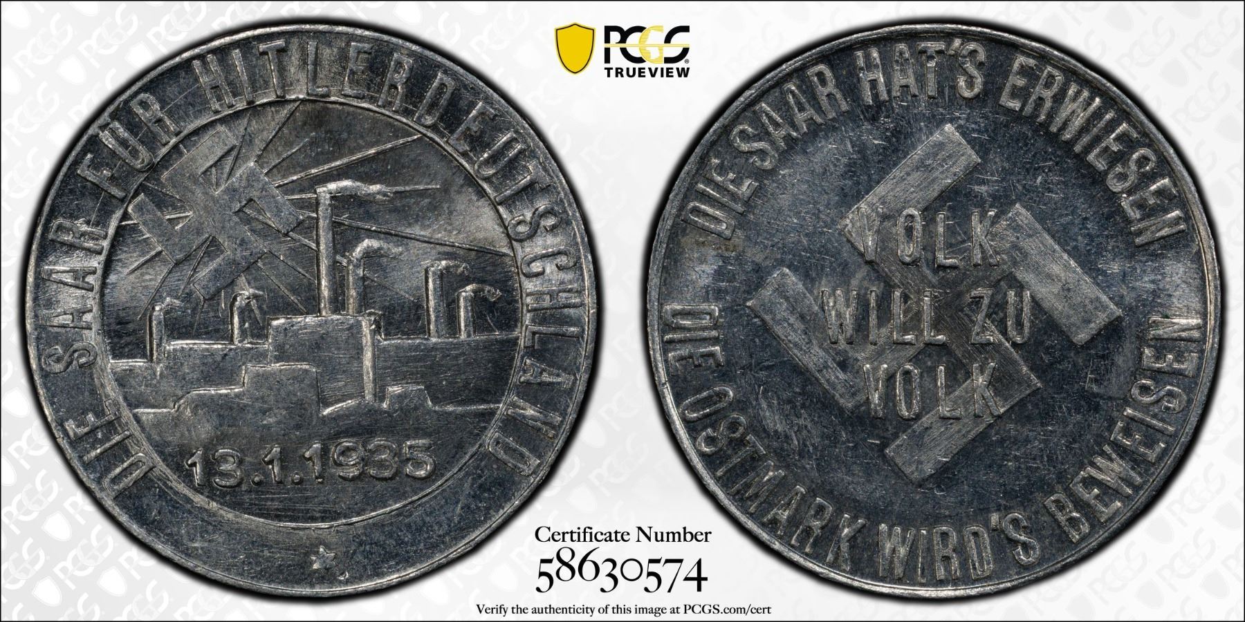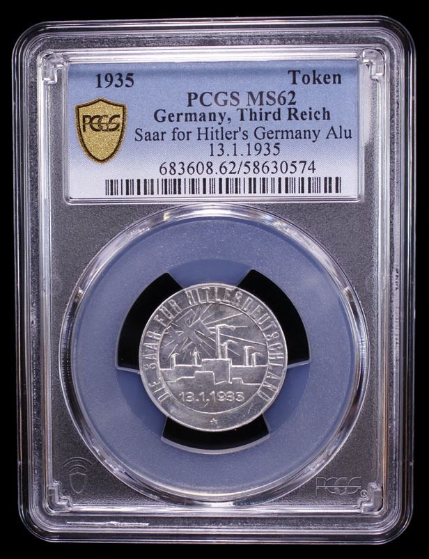 GERMANY: Third Reich, aluminum token, 1935, N-142841, 23mm, the Saarland for Hitler's Germany propaganda token; DIE SAAR HAT'S ERWIESEN / DIE OSTMARK WIRD'S BEWEISEN around VOLK WILL ZU VOLK superimposed on swastika // DIE SAAR FÜR HITLERDEUTSCHLAND around factory scene bathing in radiant swastika, 13.1.1935 below, PCGS graded MS62.