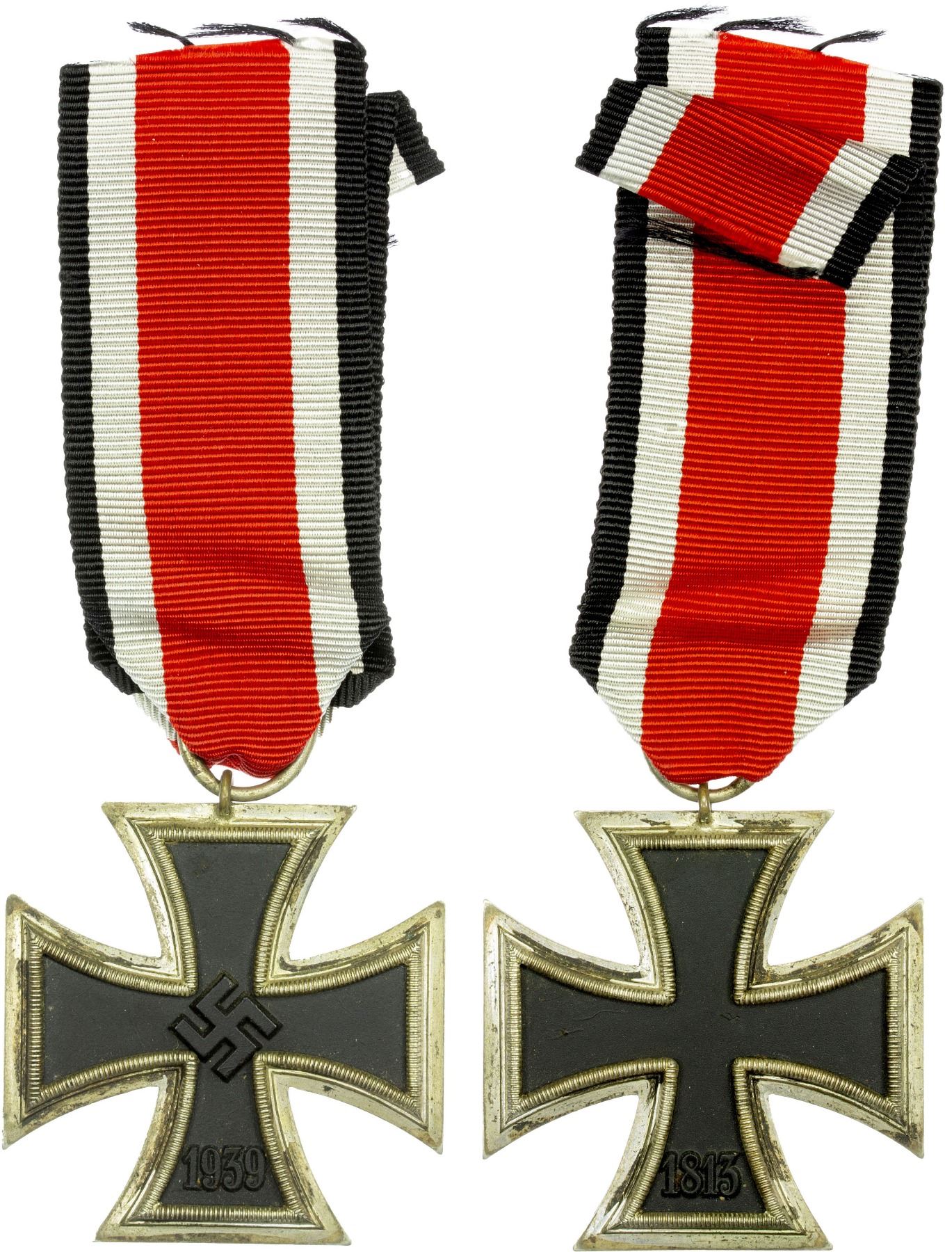 GERMANY: Third Reich, medal (20.98g), 1939, Barac-72, 44x44mm Iron Cross medal, II class cross, solid made - "Schinkel" type, cross with swastika at center and 1939 at bottom, blackened cross with silvered border // only "1813" at bottom, blackened cross with silvered border, with integral loop, ring, and red, black, and white ribbon, plain edge, Choice AU. These Third Reich items were originally produced by a regime which perpetrated crimes against humanity, war crimes, mass murder, and other acts of violence. Our firm does not endorse such activities and only offers this item as an artifact of history to further research and civil enlightenment.