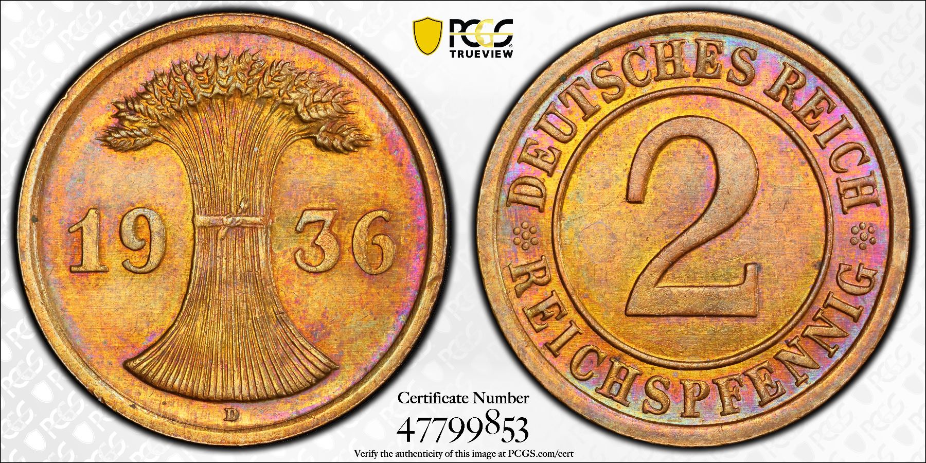 GERMANY: Thrid Reich, AE 2 reichspfennig, 1936-D, KM-38, J-314, Munich mint, a wonderful example, PCGS graded MS64 RB.