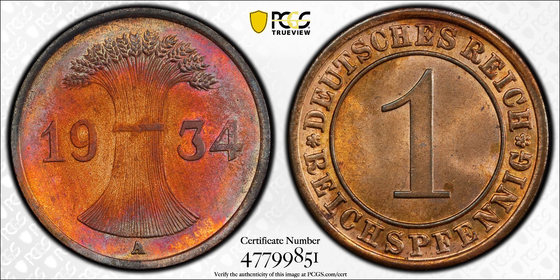 GERMANY: Thrid Reich, AE reichspfennig, 1934-A, KM-37, J-313, Berlin mint, a superb example, PCGS graded MS65 RB.