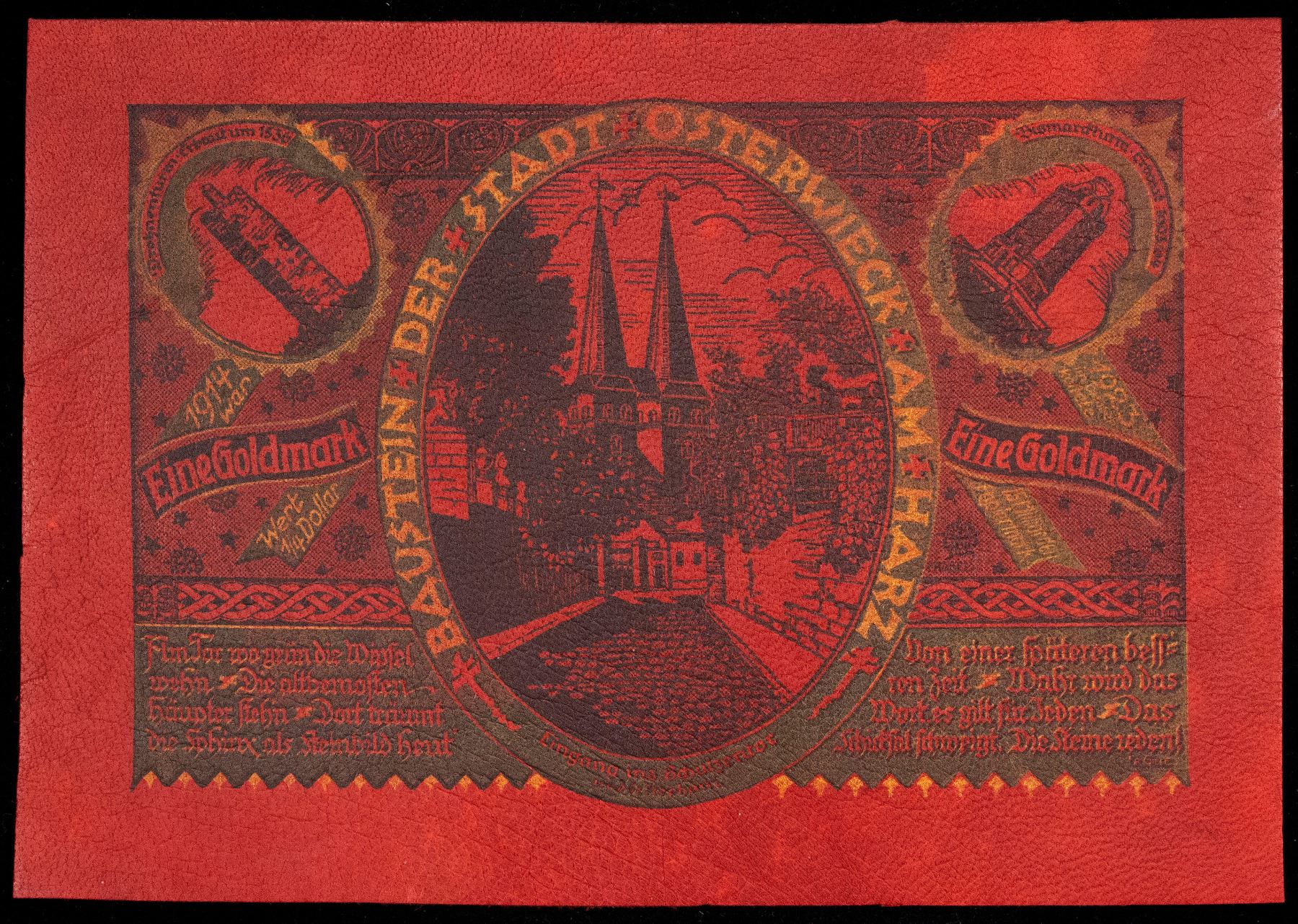 GERMANY: Weimar Republic, 1 goldmark, 1923, 96x138mm Osterwieck am Harz notgeld issue in leather; black and yellow on red leather, Choice UNC, ex Dr. Robert A. Rosenfeld Collection.