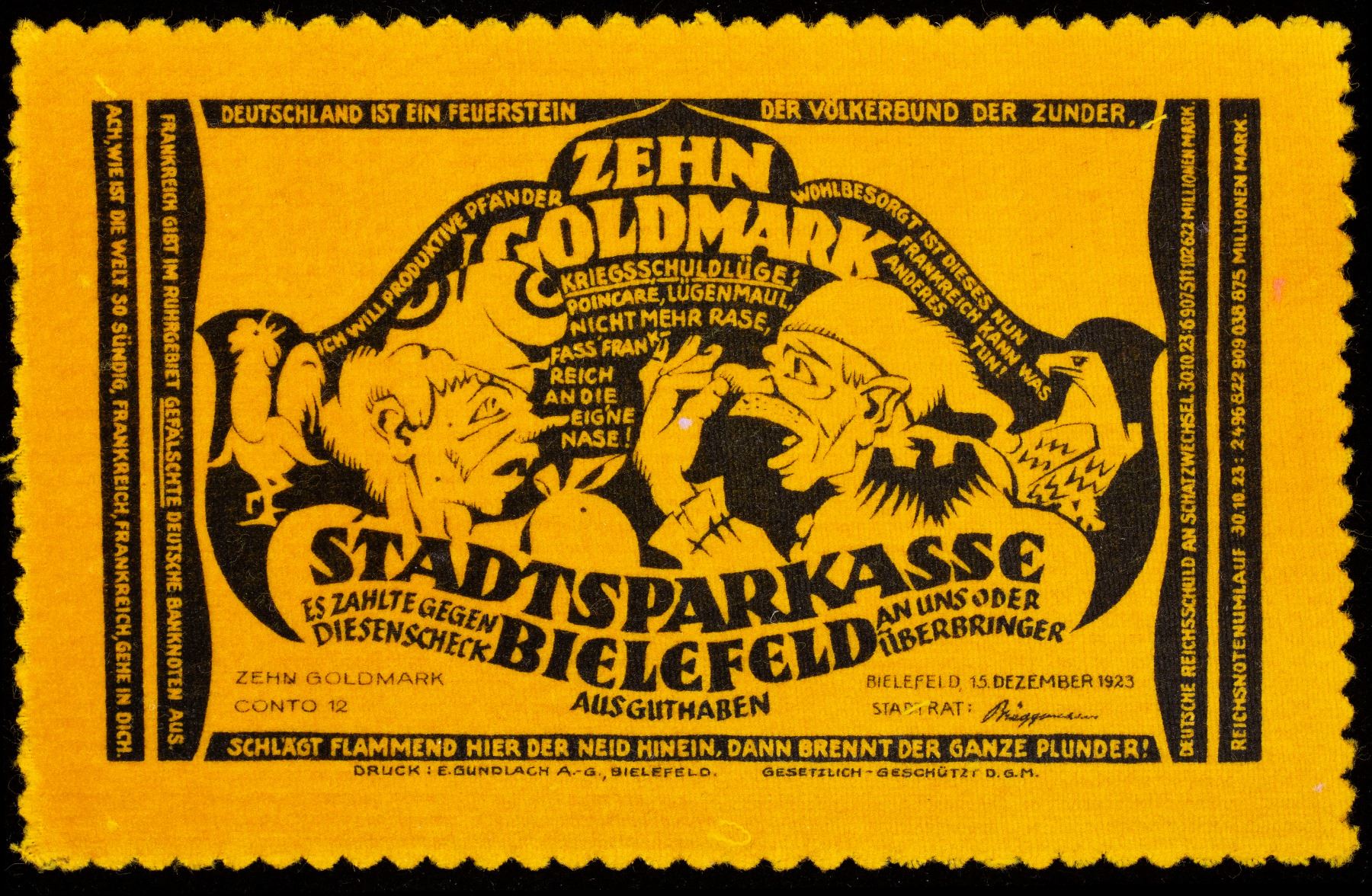 GERMANY: Weimar Republic, 10 goldmark, 15.12.1923, 79x126mm Bielefeld uniface notgeld issue in velvet fabric, black on yellow, Choice UNC, ex Dr. Robert A. Rosenfeld Collection.