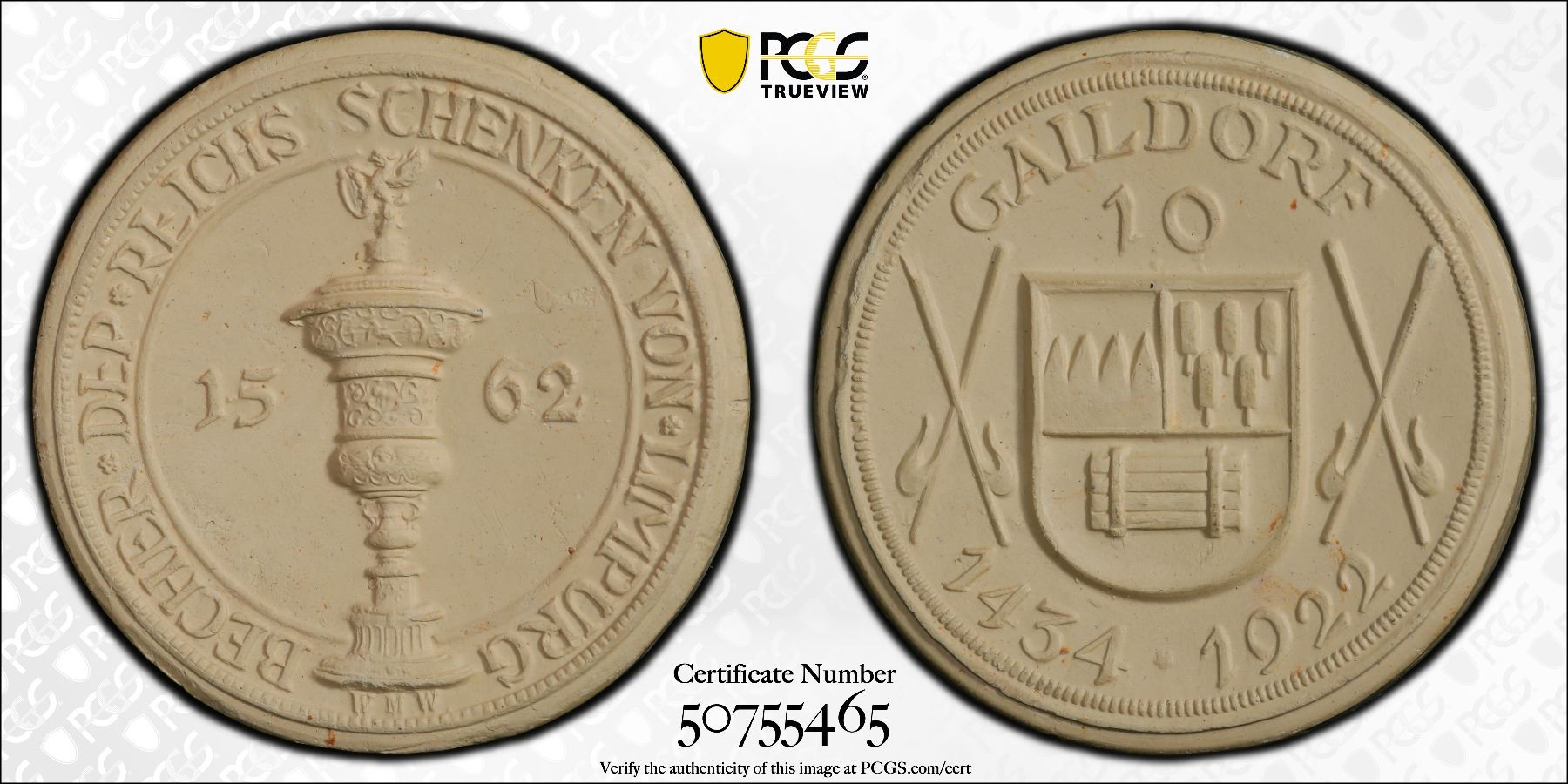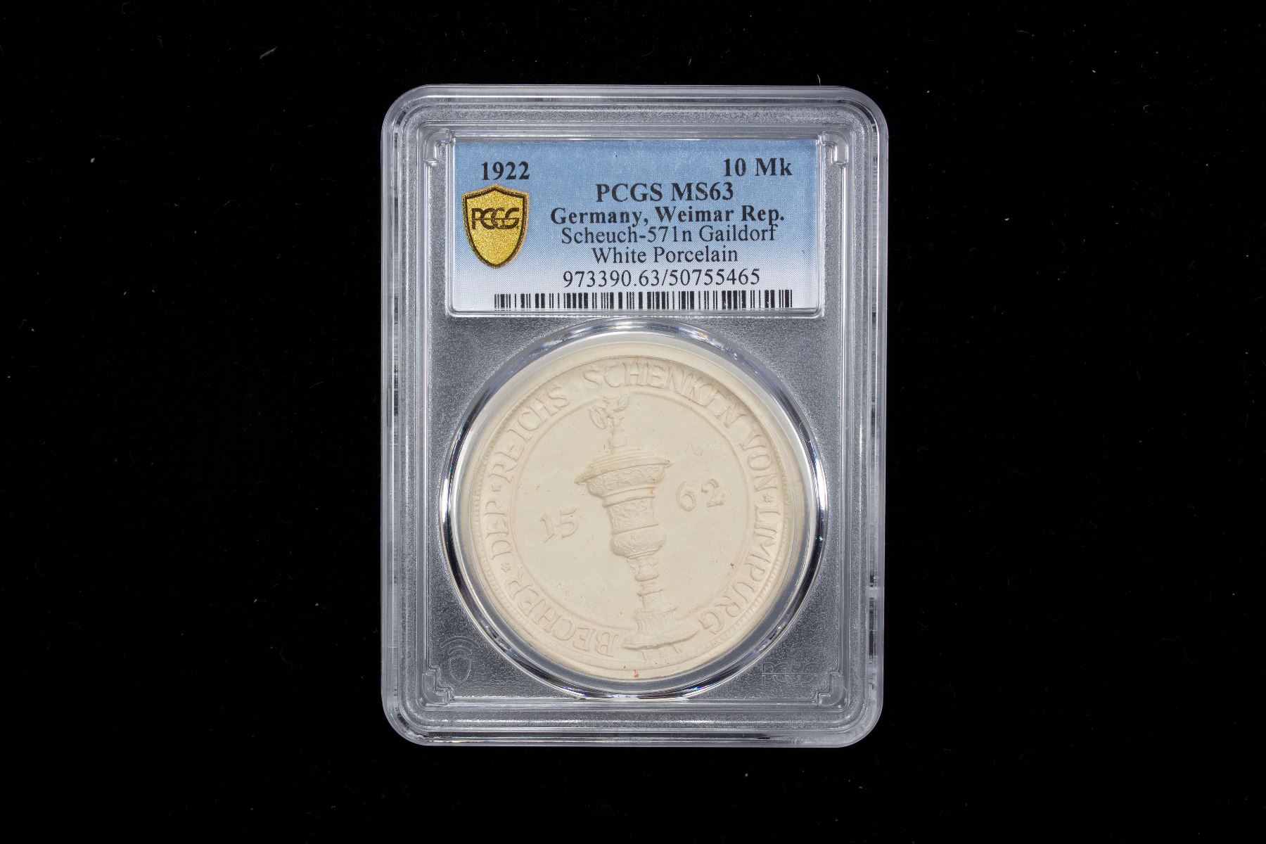 GERMANY: Weimar Republic, 10 mark, Gaildorf, 1922, Scheuch-571n, white porcelain, medallic, sometimes referred to as "spendenmedaillen", a lovely intricately etched wedding cake white mint state example! PCGS graded MS63.