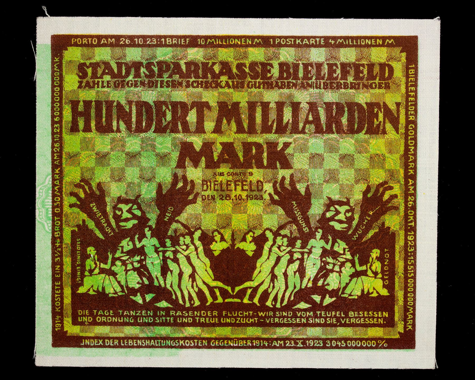 GERMANY: Weimar Republic, 100 billion mark, 28.10.1923, 95x109mm Bielefeld notgeld issue in linen; brown, green, and yellow on white cloth, Choice UNC, ex Dr. Robert A. Rosenfeld Collection.