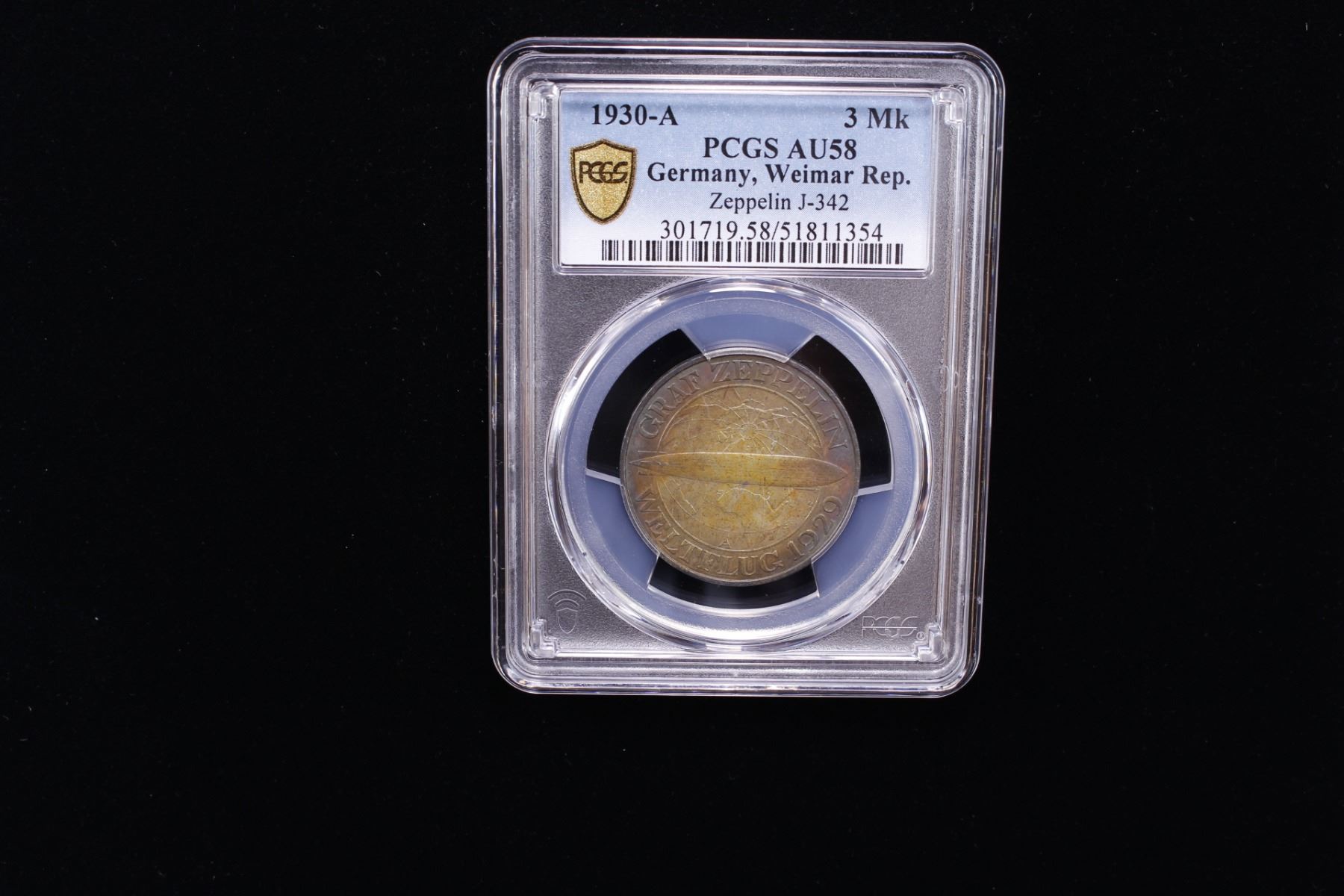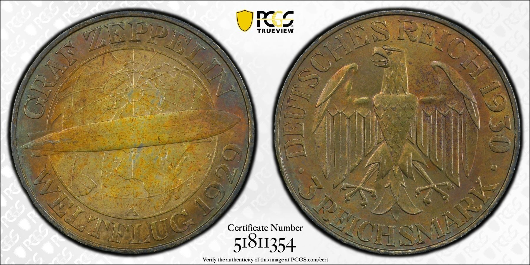 GERMANY: Weimar Republic, 1919-1932, AR 3 reichsmark, 1930-A, KM-56, J-342, World flight of the Graf Zeppelin issue, PCGS graded AU58, ex Almer H. Orr III Collection.