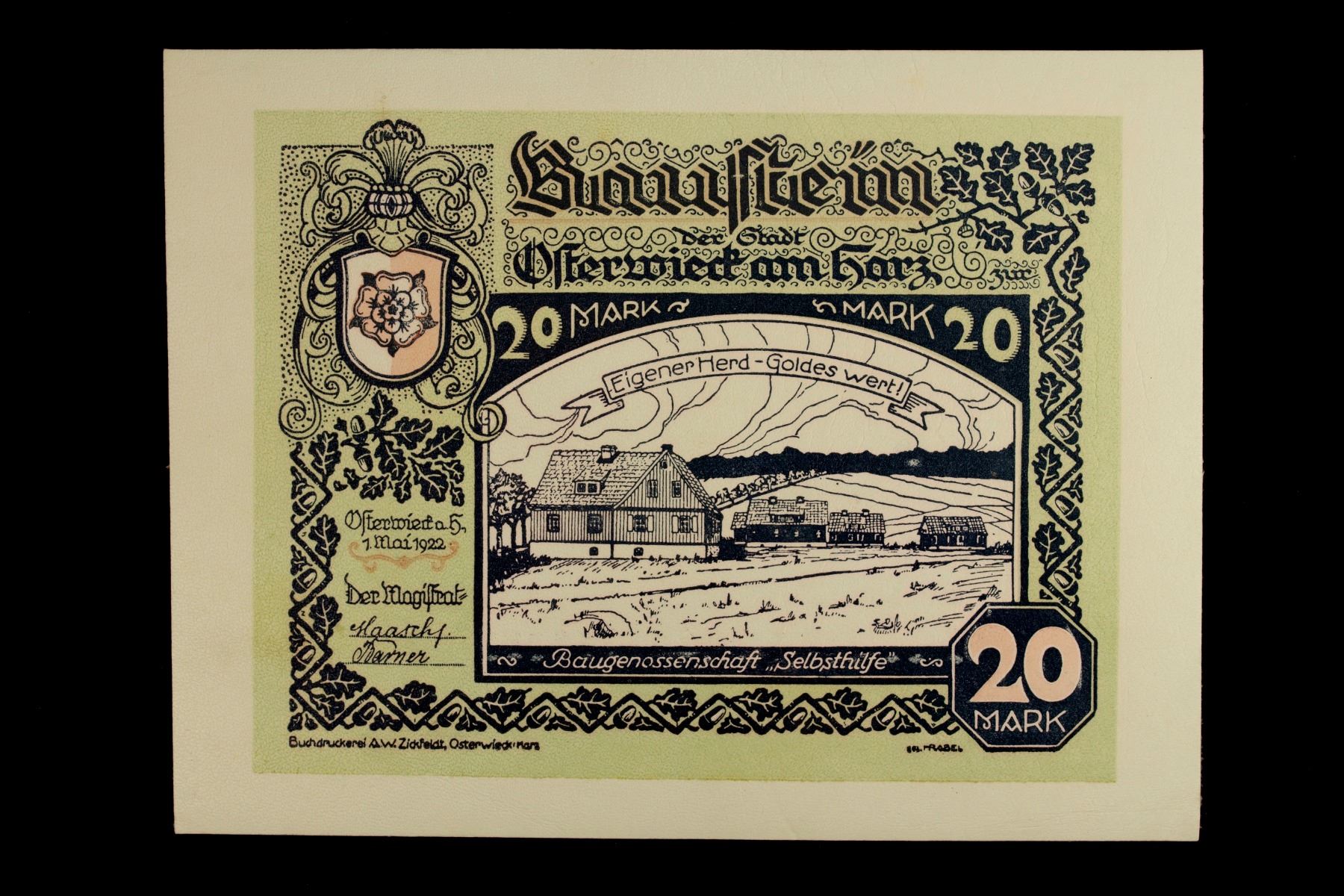 GERMANY: Weimar Republic, 20 mark, 1.5.1922, 116x154mm Osterwieck am Harz leather notgeld issue; light green, pink, and black on white leather, Choice AU, ex Dr. Robert A. Rosenfeld Collection.