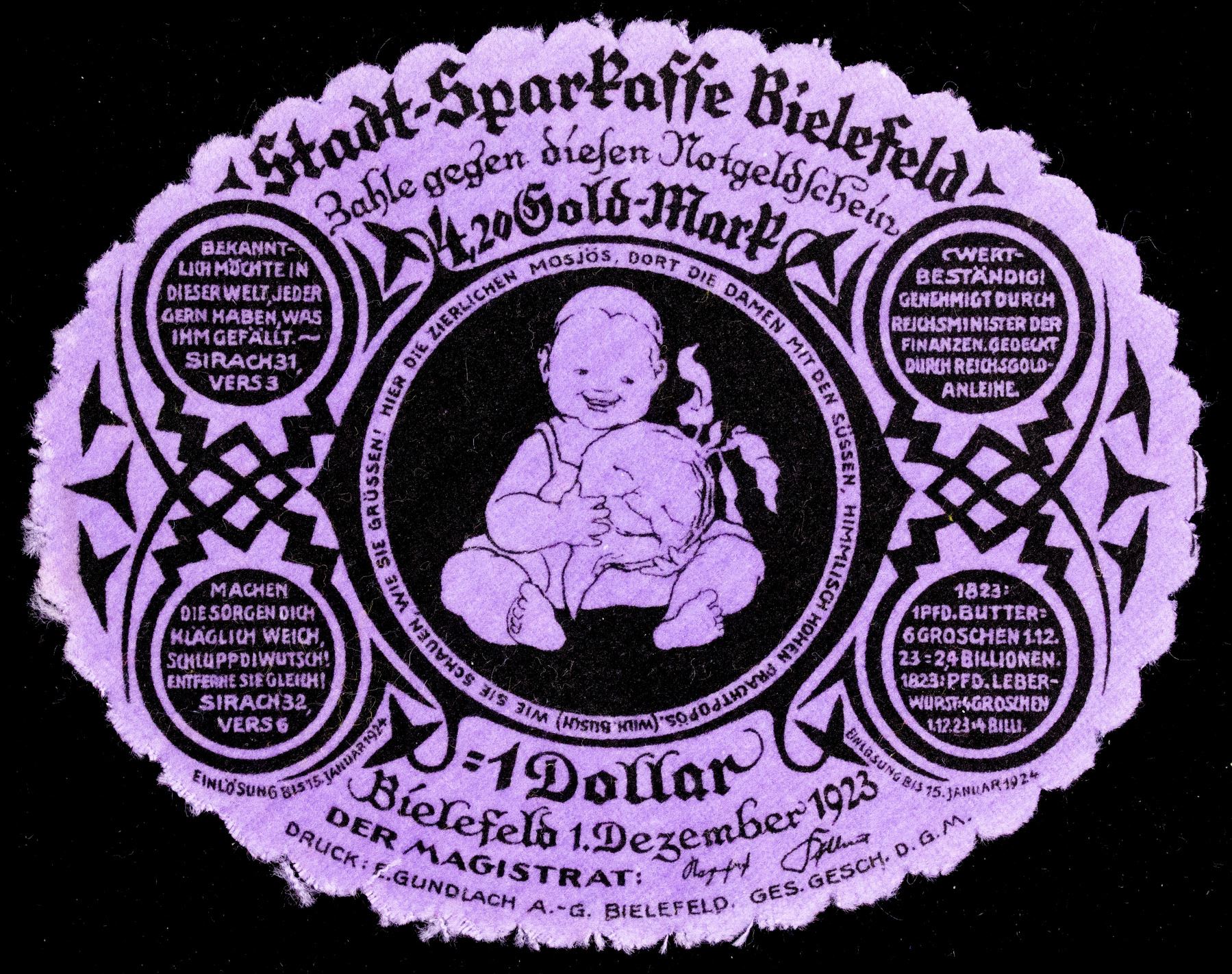 GERMANY: Weimar Republic, 4.20 goldmark (1 dollar), 1.12.1923, 70x89mm Bielefeld oval uniface notgeld issue in velvet fabric, black on purple, child with rutabaga, rare, Choice UNC, ex Dr. Robert A. Rosenfeld Collection.
