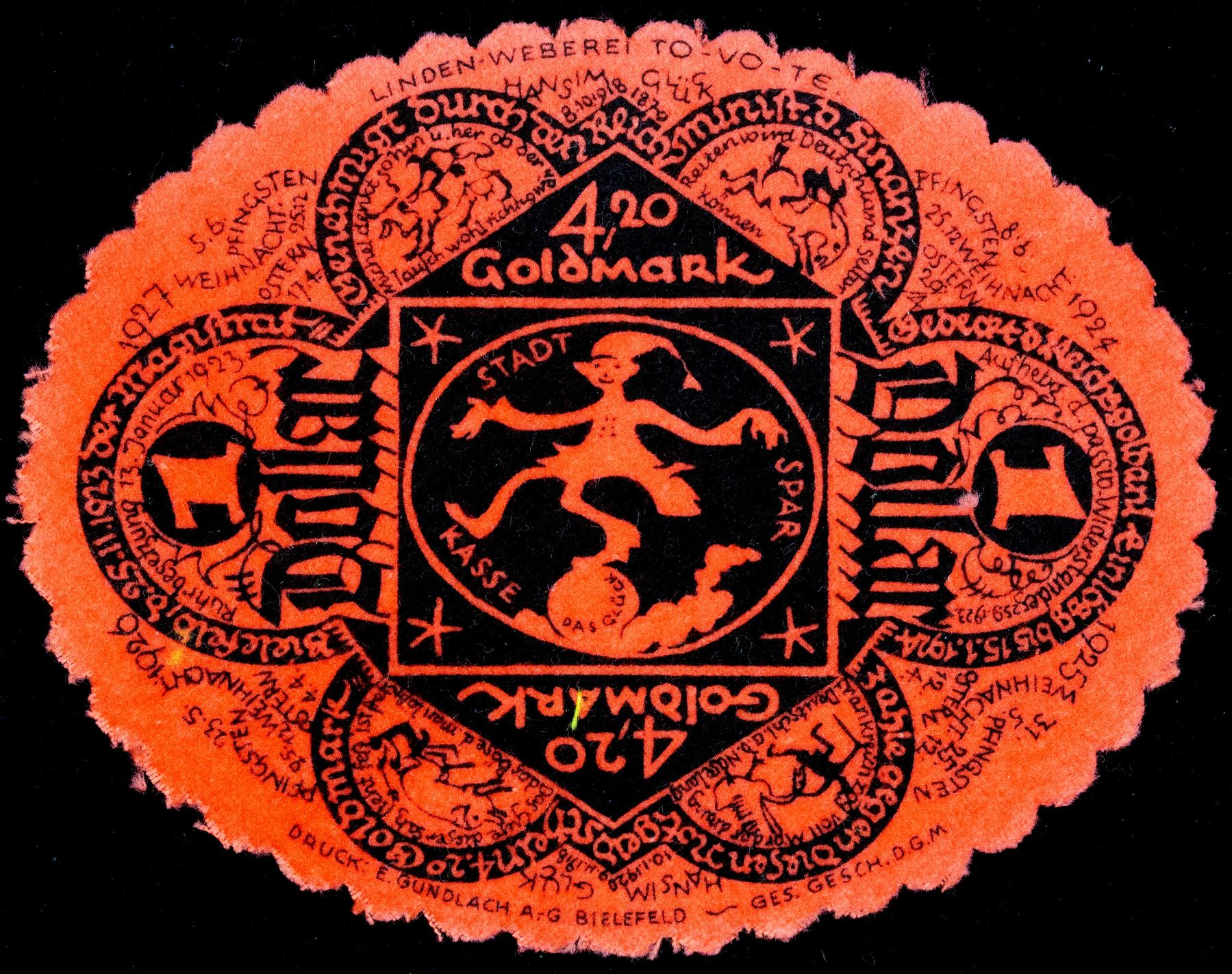 GERMANY: Weimar Republic, 4.20 goldmark (1 dollar), 25.11.1923, 70x90mm Bielefeld oval uniface notgeld issue in velvet fabric, black on red, jester, rare, Choice UNC, ex Dr. Robert A. Rosenfeld Collection.