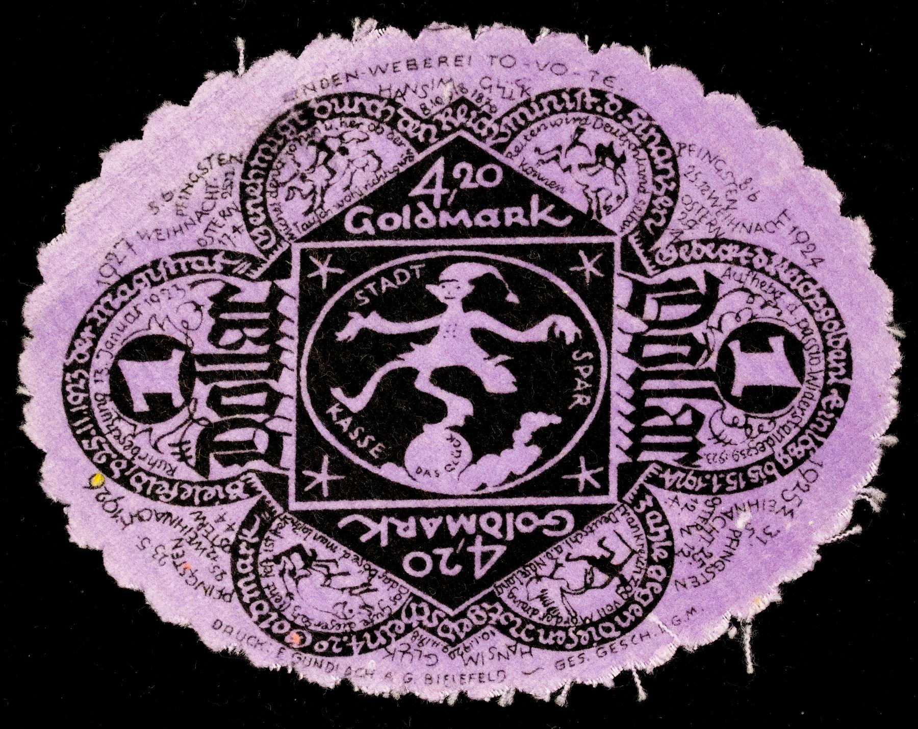 GERMANY: Weimar Republic, 4.20 goldmark (1 dollar), 25.11.1923, Grabowski-106, Grasser/Pick-55b, 70x90mm Bielefeld oval uniface notgeld issue in velvet fabric, black on purple, jester, rare, Unc, ex Dr. Robert A. Rosenfeld Collection.