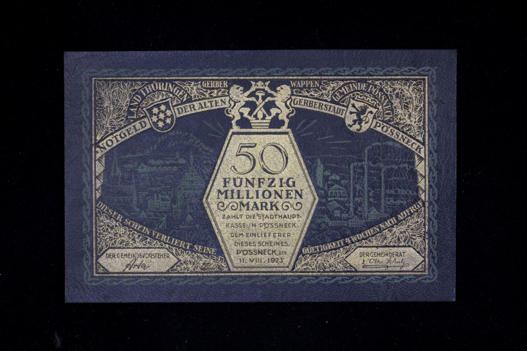 GERMANY: Weimar Republic, 50 million mark, 11.8.1923, 90x140mm Poessneck leather issue, green, gold, and pink on black leather, AU, ex Dr. Robert A. Rosenfeld Collection.