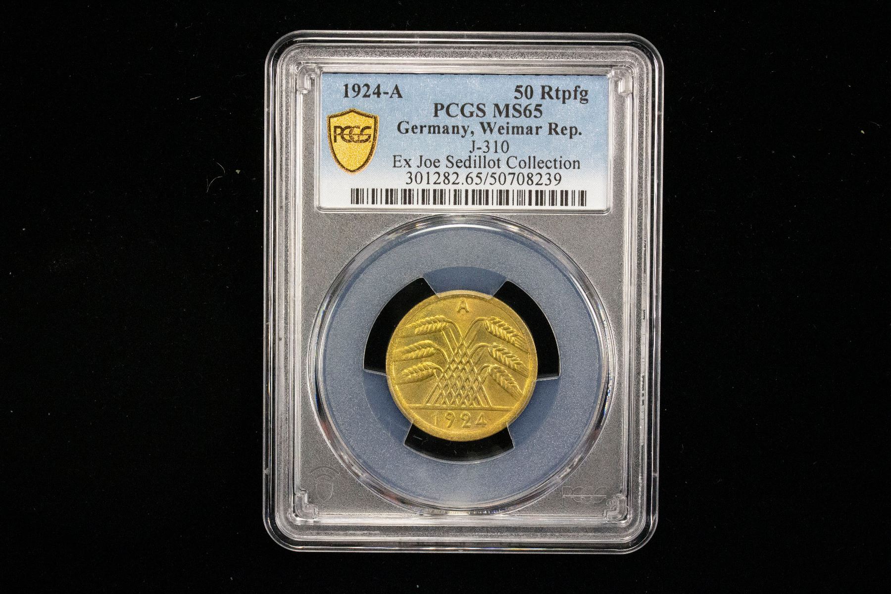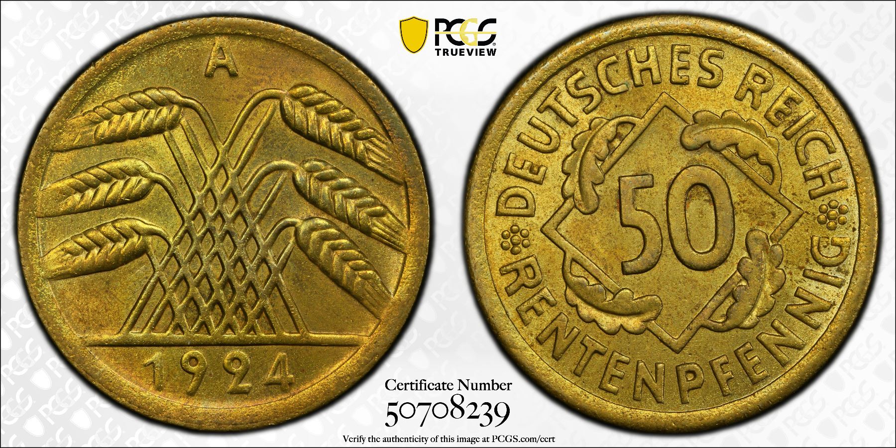 GERMANY: Weimar Republic, 50 reichspfennig, 1924-A, KM-34, J-310, a superb mint state example! PCGS graded MS65, ex Joe Sedillot Collection.