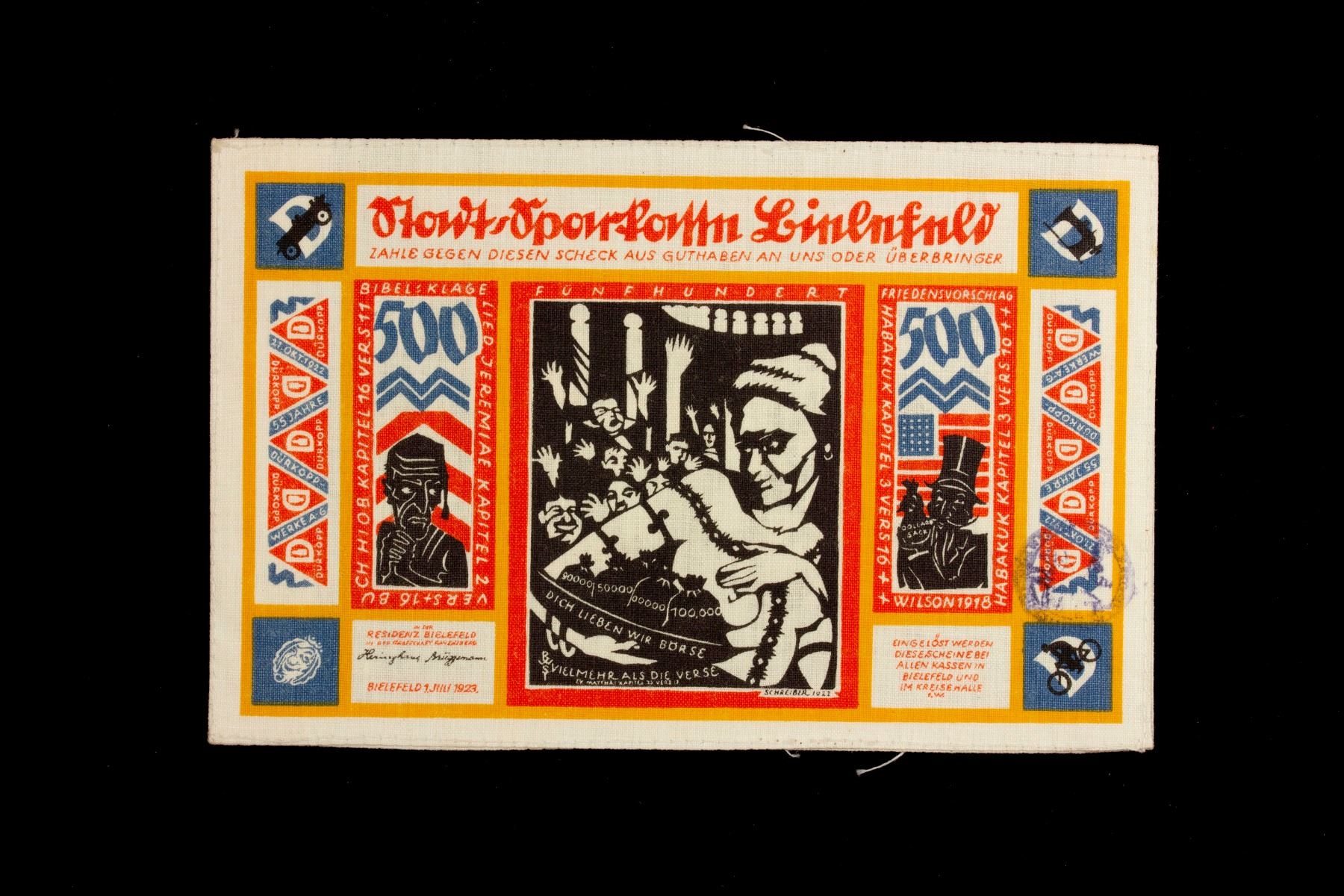 GERMANY: Weimar Republic, 500 mark, 1.7.1923, 88x135mm Bielefeld uniface linen notgeld issue, "Breastfeeding Wall Street" anti-US propaganda note, Choice Unc, ex Dr. Robert A. Rosenfeld Collection.