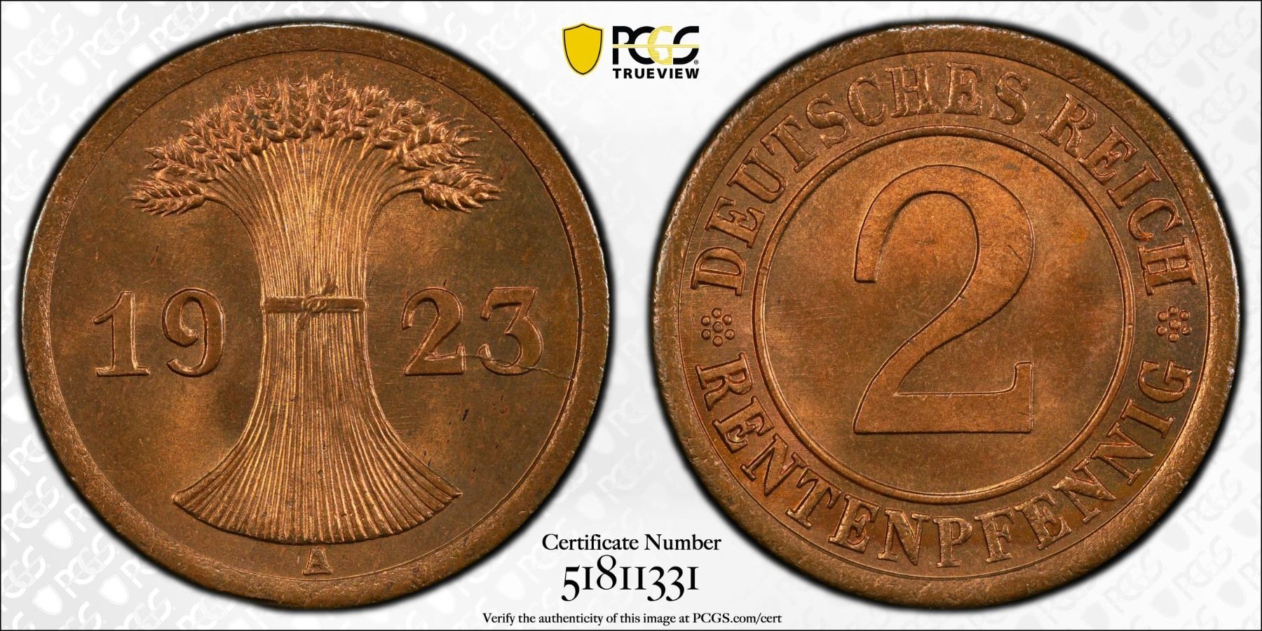 GERMANY: Weimar Republic, AE 2 reichspfennig, 1923-A, PCGS MS66 RD